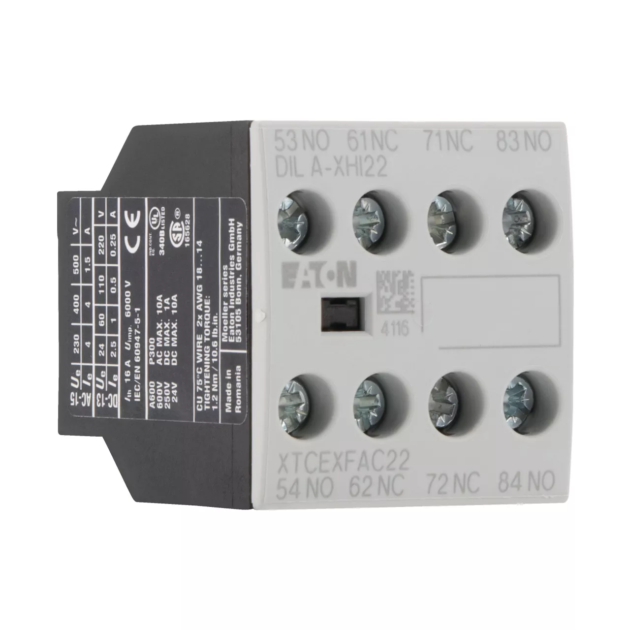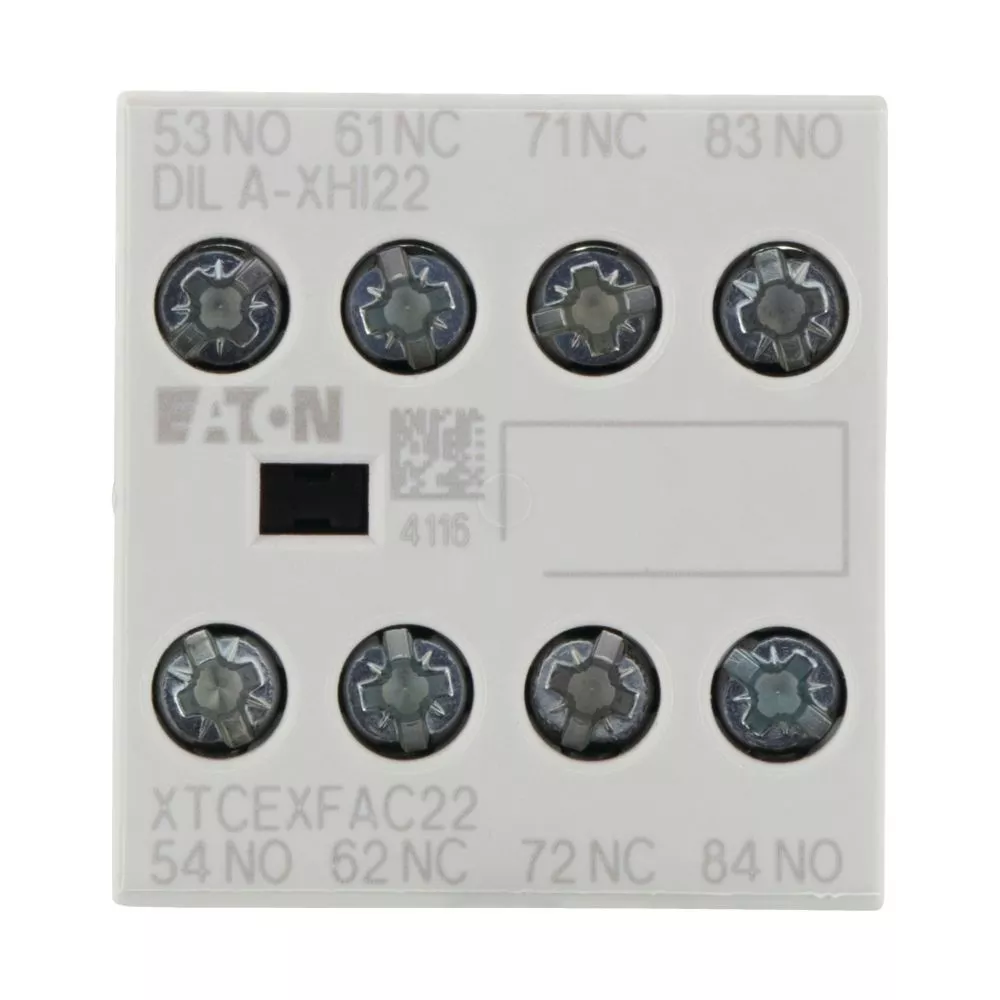 Hulpcontactblok, met onderling vergrendelde tegenoverliggende contacten, schakelelementen volgens EN 50005, versie E combinaties komen overeen met EN 50011 en hebben de voorkeur. De DC bekrachtigde relais DILA(C)-22 mag alleen worden gecombineerd met 2-polige hulpcontacten. Functie: voor standaard toepassingen, 4-polig, aansluittechniek: schroefklemmen, nominale bedrijfsstroom AC-15 220 V 230 V 240 V: Ie= 4 A, nominale bedrijfsstroom AC-15 380 V 400 V 415 V: Ie= 4 A, contacten no = normaal open: 2 no, contacten nc = normaal gesloten: 2 nc, type montage: Frontbevestiging, voor gebruik met: DILA(C)…, DILM(C)7…, DILM(C)9…, DILM(C)12…, DILM(C)15…