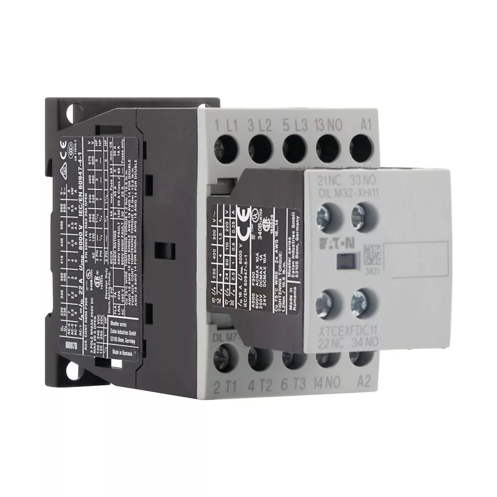 Leistungsschütz, Anwendung: Leistungsschütze für Motoren, Komplettgeräte größer 170 A, Gebrauchskategorie: AC-1: Nicht oder leicht induktive Lasten, Widerstandsöfen, NAC-3: Käfigläufermotoren: anlassen, während Betrieb ausschalten, AC-4: Käfigläufermotoren: anlassen, Einstecken, reversieren, Tippen, Anschlusstechnik: Schraubklemmen, Hinweise: Geeignet auch für Motoren der Effizienzklasse IE3., IE3-fähige Geräte sind mit dem Logo auf der Verpackung gekennzeichnet., Bemessungsbetriebsstrom AC-3, 380 V, 400 V: Ie= 7 A, Bemessungsbetriebsstrom AC-1 konventioneller thermischer Strom, 3-polig
