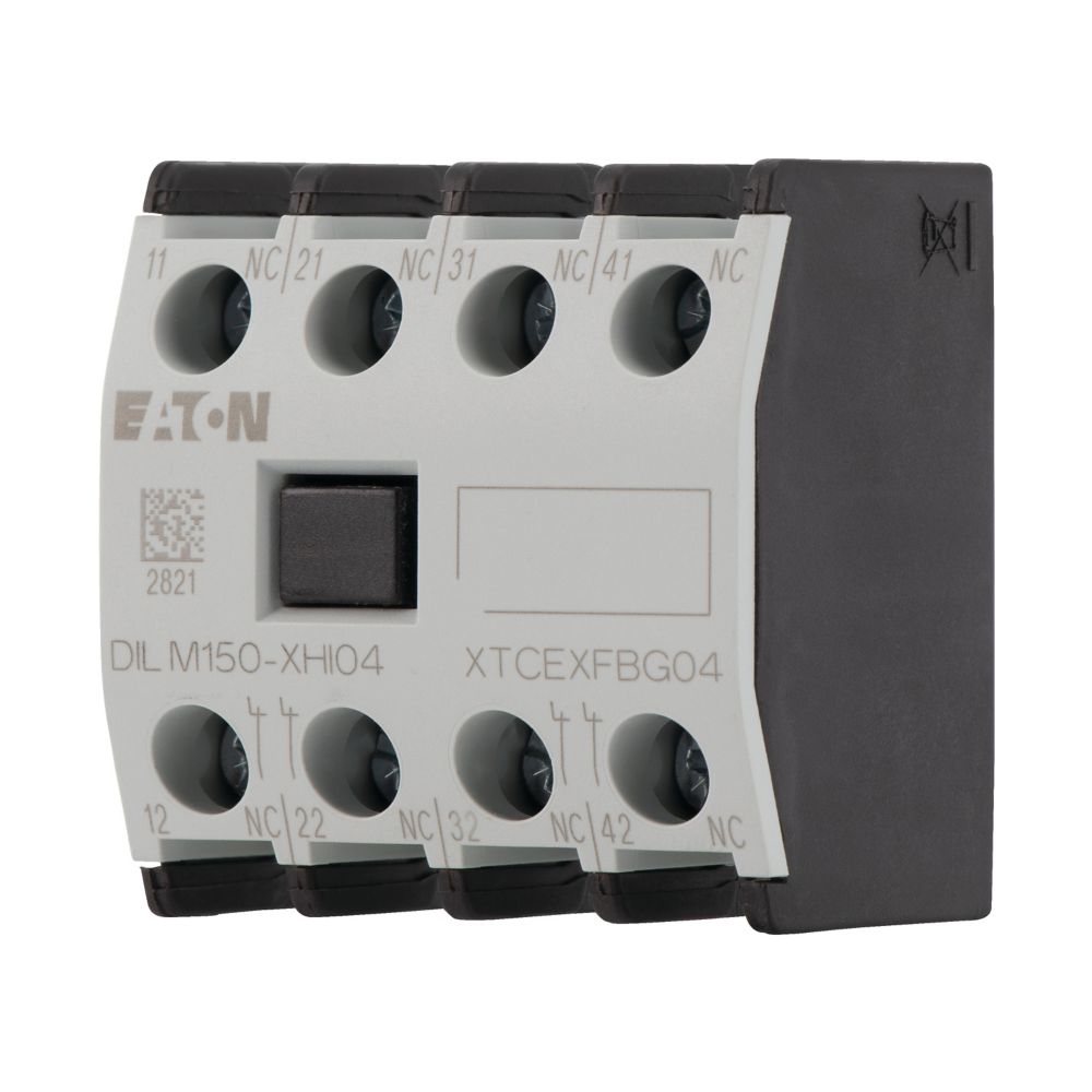 Hulpcontactblok, met onderling vergrendelde tegenoverliggende contacten, functie: voor standaard toepassingen, 4-polig, aansluittechniek: schroefklemmen, nominale bedrijfsstroom AC-15 220 V 230 V 240 V: Ie= 6 A, nominale bedrijfsstroom AC-15 380 V 400 V 415 V: Ie= 4 A, contacten nc = normaal gesloten: 4 nc, type montage: Frontbevestiging, voor gebruik met: DILM40…, DILM50…, DILM65…, DILM72…, DILM80…, DILM95…, DILM115…, DILM150…, DILM170…, DILMP63…, DILMP80…, DILMP125…, DILMP160…, DILMP200…, DILMF40…, DILMF50…, DILMF65…, DILMF80…, DILMF95…, DILMF115…, DILMF150…, Type: Hulpcontact voor frontmontage