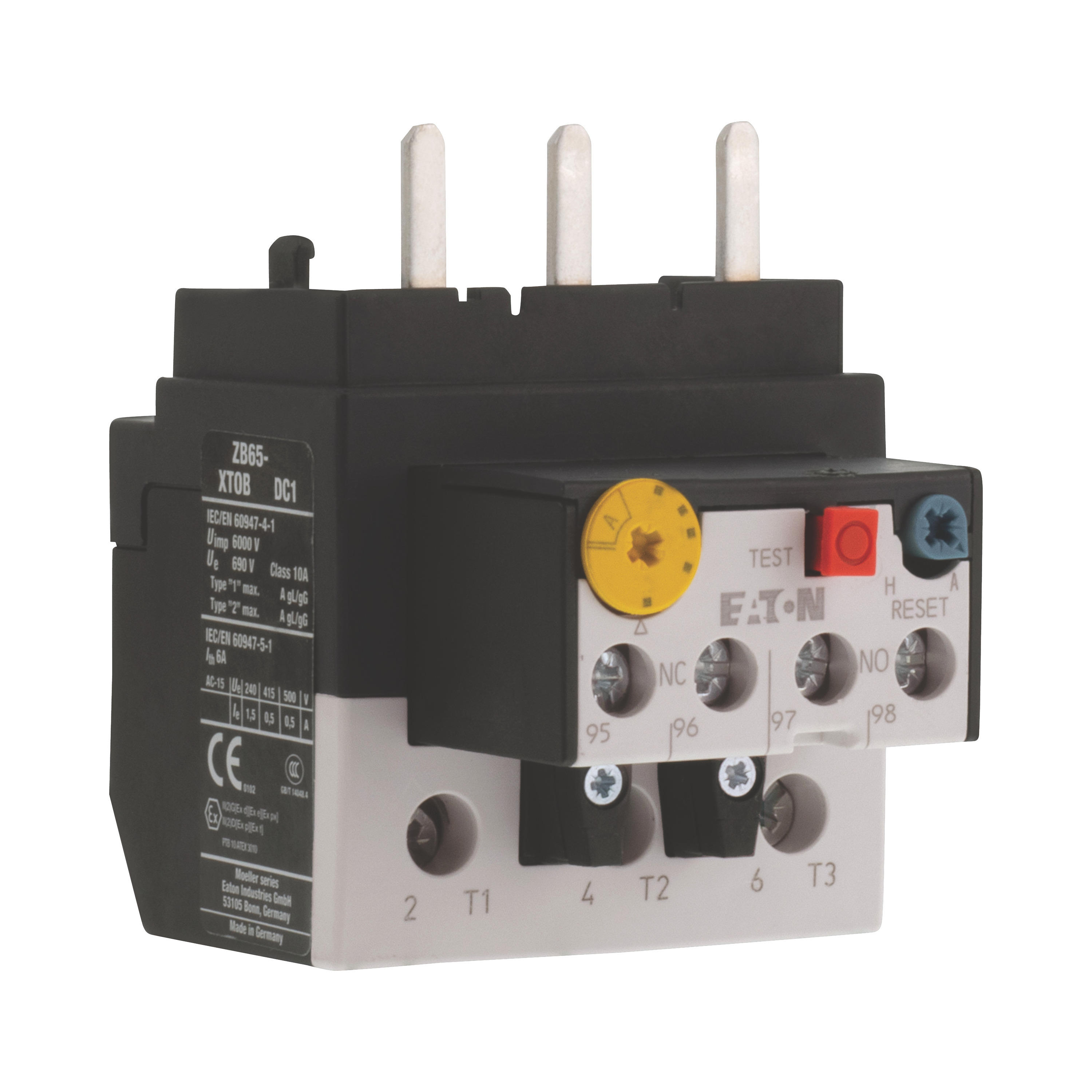 Przekaźnik przeciążeniowy, Zacisk śrubowy: Przekaźnik przeciążeniowy ZB do 150 A, Akcesoria: Przekaźniki przeciążeniowe, Wielkość: ZB65, Czułość na zanik fazy: IEC/EN 60947, VDE 0660 część 102, Opis: Przycisk test/wył., Przycisk resetowania ręcznego/automatycznego, Wyzwalanie swobodne, Typ mocowania: Montaż bezpośredni, Styki pomocnicze Z = Zwierne: 1 Z, Styki pomocnicze R = Rozwierne: 1 R, Do zastosowania z: DILM40, DILM50, DILM65, DILM72, DILMF40, DILMF50, DILMF65, DIULM40, DIULM50, DIULM65, SDAINLM70, SDAINLM90, SDAINLM115, Normy: IEC/EN 60947, VDE 0660, UL, CSA, Stopień ochrony: IP00