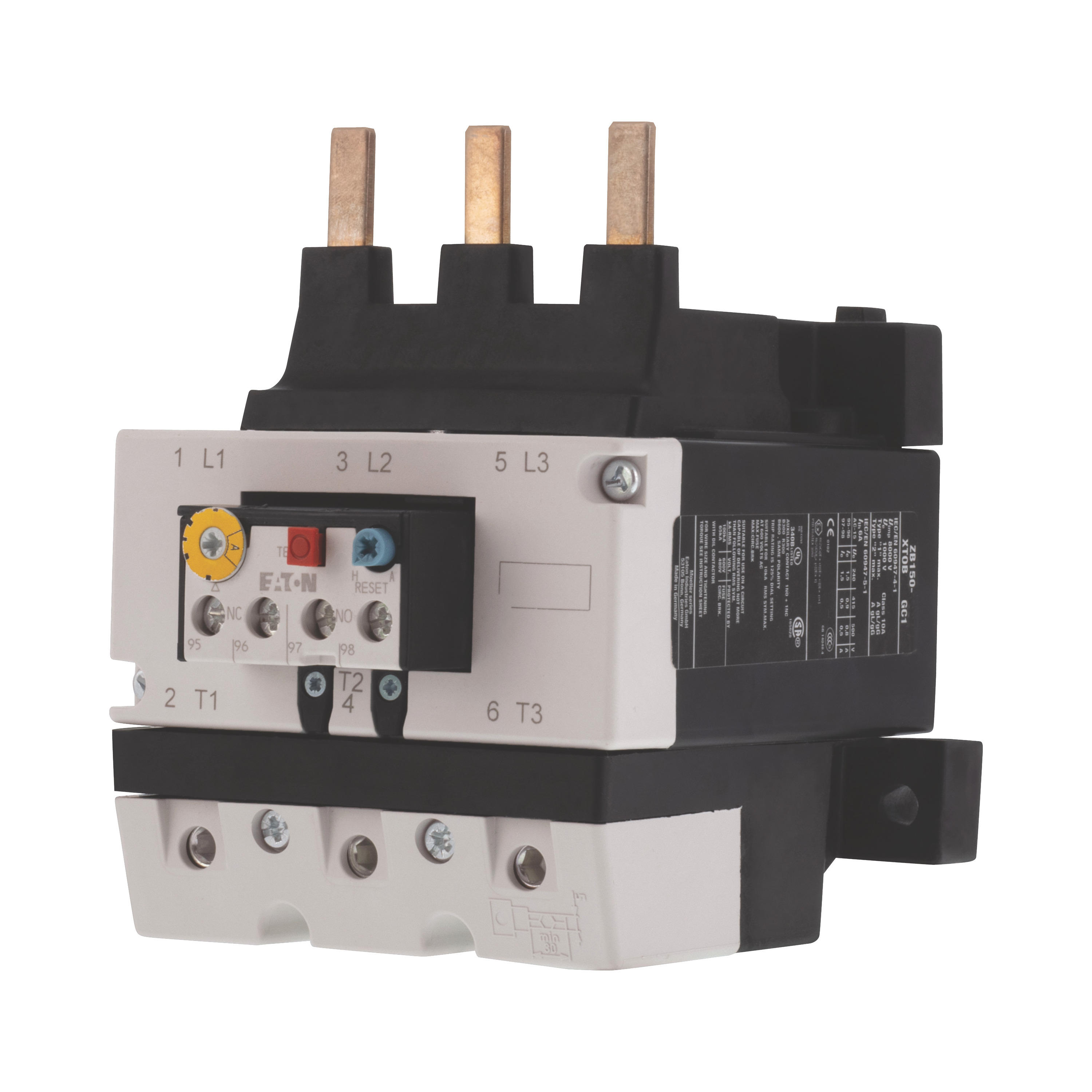Przekaźnik przeciążeniowy, Zacisk śrubowy: Przekaźnik przeciążeniowy ZB do 150 A, Akcesoria: Przekaźniki przeciążeniowe, Wielkość: ZB150, Czułość na zanik fazy: IEC/EN 60947, VDE 0660 część 102, Opis: Przycisk test/wył., Przycisk resetowania ręcznego/automatycznego, Wyzwalanie swobodne, Typ mocowania: Montaż bezpośredni, Styki pomocnicze Z = Zwierne: 1 Z, Styki pomocnicze R = Rozwierne: 1 R, Do zastosowania z: DILM80, DILM95, DILM115, DILM150, DILM170, DILMF80, DILMF95, DILMF115, DILMF150, DIULM80, DIULM95, DIULM115, DIULM150, SDAINLM140, SDAINLM165, SDAINLM200, SDAINLM260, Normy: IEC/EN 60947, VDE 0660, UL, CSA, Stopień ochrony: IP00