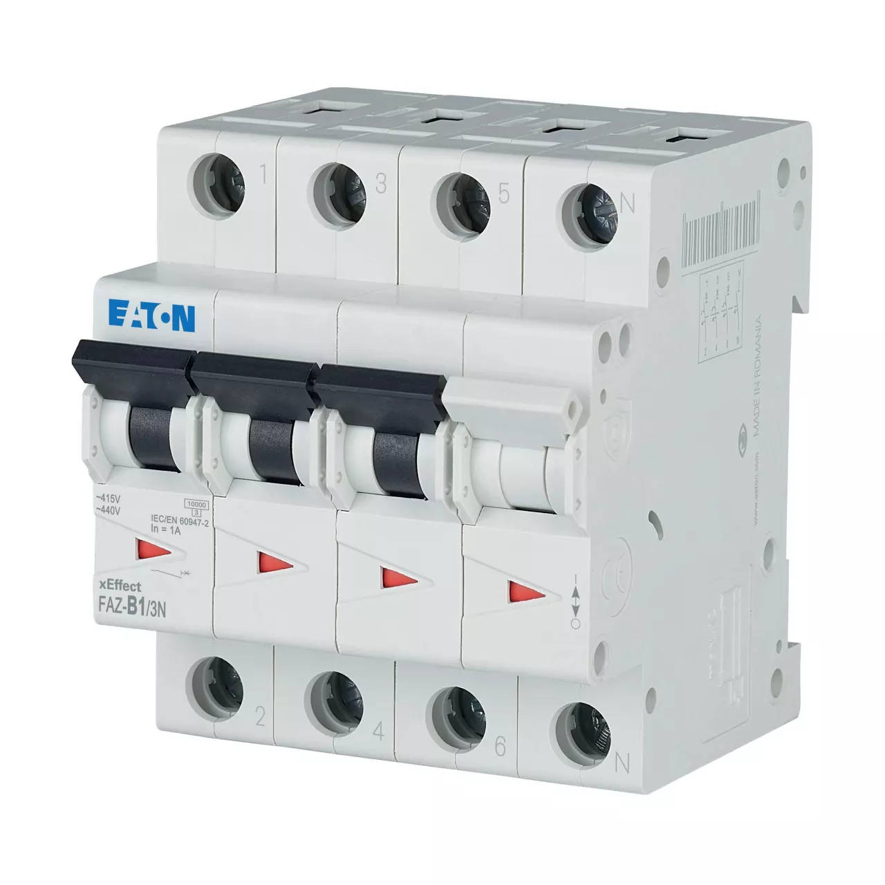 Installatieautomaat (MCB), FAZ, 3-polig+N, afschakelkarakteristiek: B, nominale stroom In: 1 A, nominaal schakelvermogen (IEC/EN 60947-2): 15 kA, Schakelapparatuur industriële en geavanceerde commerciële toepassingen