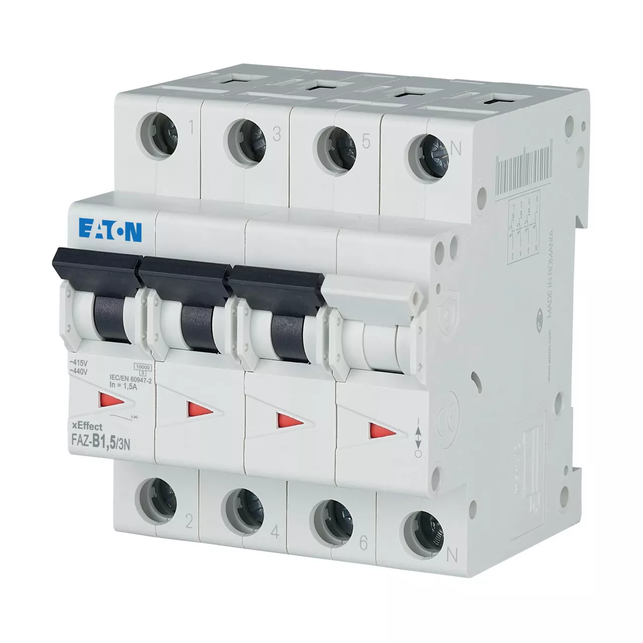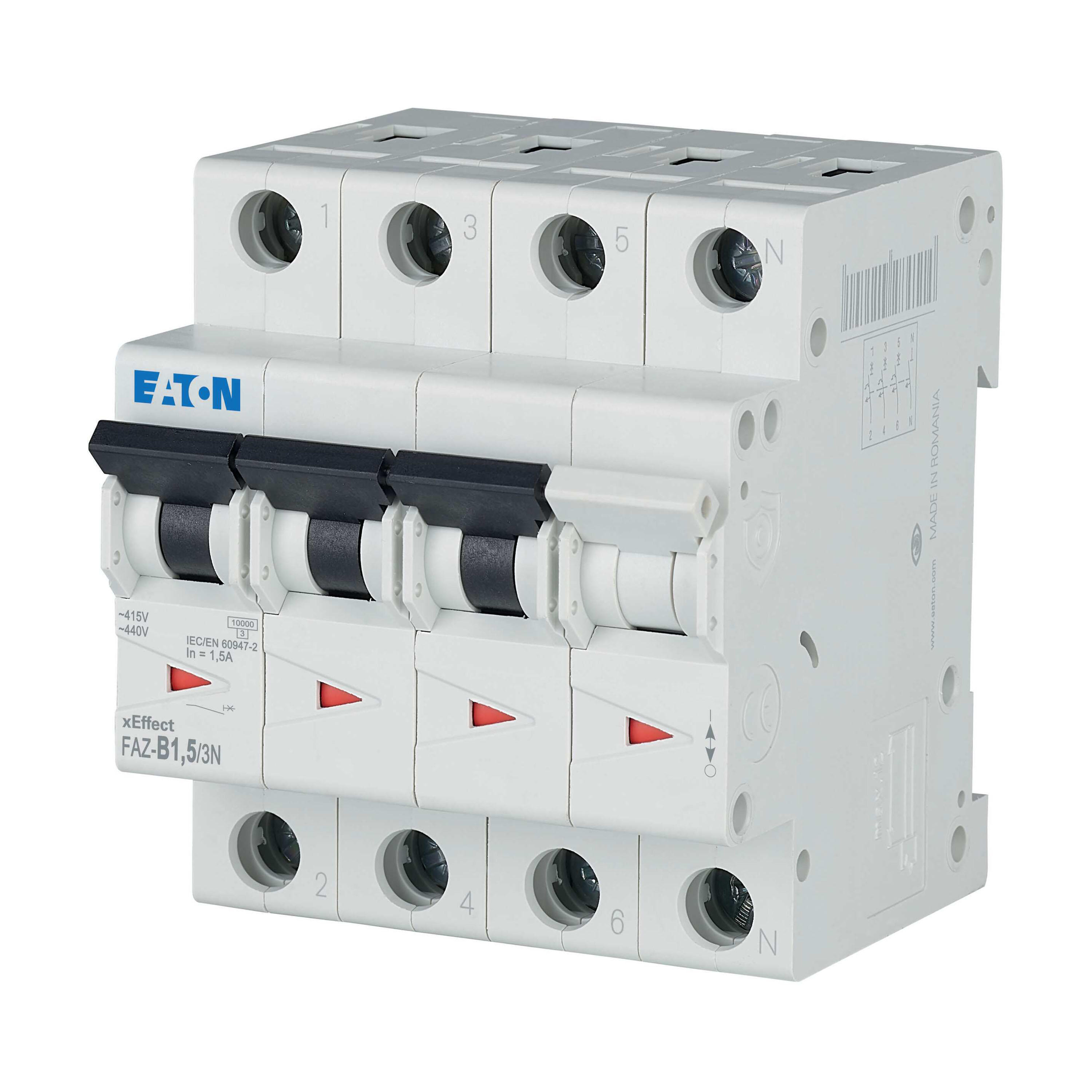 Installatieautomaat (MCB), FAZ, 3-polig+N, afschakelkarakteristiek: B, nominale stroom In: 1,5 A, nominaal schakelvermogen (IEC/EN 60947-2): 15 kA, Schakelapparatuur industriële en geavanceerde commerciële toepassingen