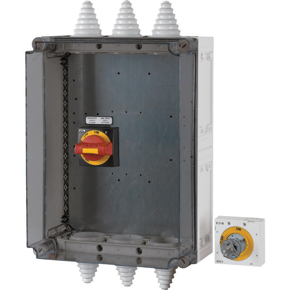Isolierstoffgehäuse Ci, Schutzart IP65, HxBxT=500x375x225mm, für NZM Baugröße 2, Schutzklasse 2, schlagfestes Polycarbonat, Schalter-Türkupplungsdrehgriff rot/gelb inklusive, Montageplatte vorgebohrt für Schalter und optionale PE/N-Klemmen, Gehäuseabdeckung vorbereitet für Drehgriff, Kappe transparent rauchgrau, Laschen für die Wandmontage, einschließlich Kabeleinführungsflansch oben und unten sowie Kabeleinführungstülle.