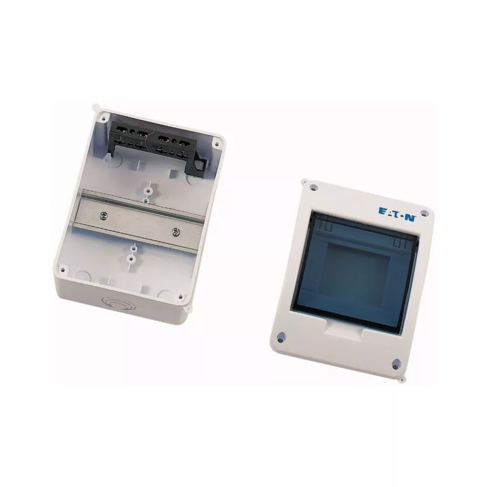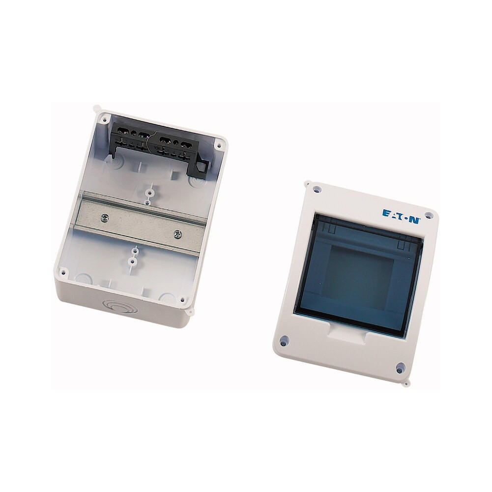 ECO compacte verdeler, opbouw, wit RAL9003, IP40 beschermingsgraad volgens IEC/EN 62208, 5 module-units, 1-rij, beschermingsklasse 2, volledig geïsoleerd, goedgekeurd voor installatieverdeler voor gebouwen conform IEC/EN 61439-3 VDE 0660-600-3, behuizing volledig gemaakt van ABS, voor het installeren van schakel- en beveiligingscomponenten, in overeenstemming met afmetingenstandaard DIN 43 880, met een installatiediepte van 70 mm, AC 400 V, RoHS-conform, bestaande uit een kunststof basis met een DIN-rail van verzinkt plaatstaal, vingeraanrakingsveilige IP2X nulgeleider- en aardklemmen