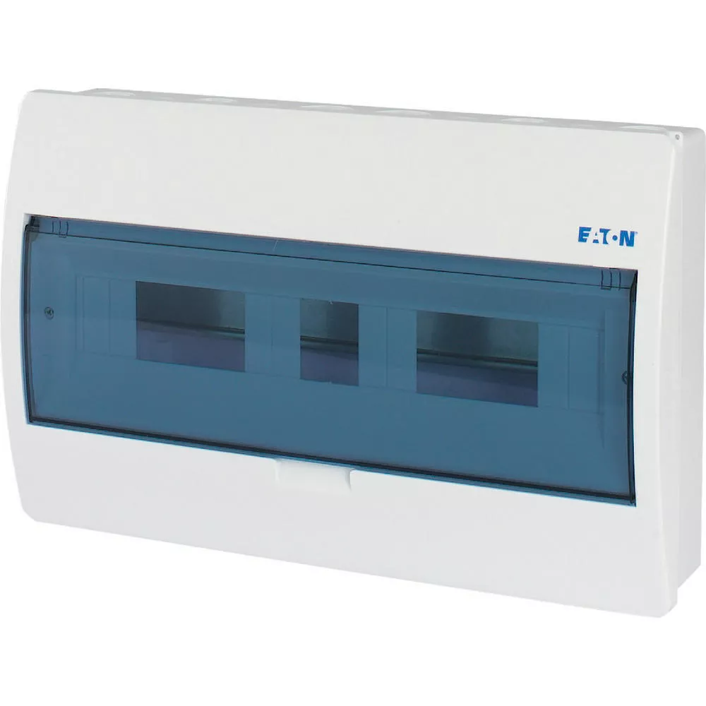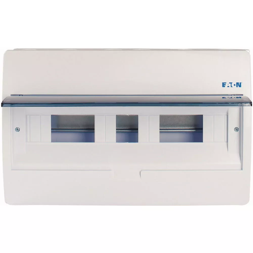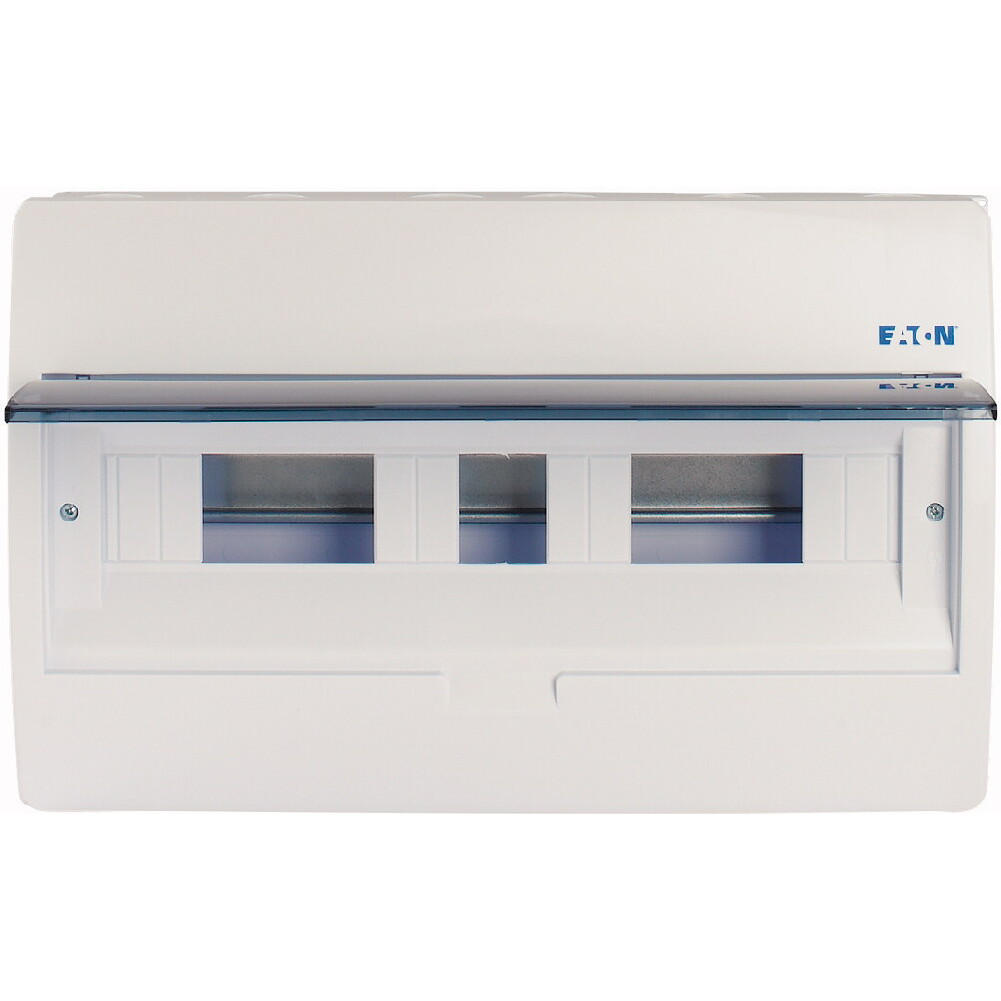 ECO compacte verdeler, opbouw, wit RAL9003, IP40 beschermingsgraad volgens IEC/EN 62208, 18 module-units, 1-rij, beschermingsklasse 2, volledig geïsoleerd, goedgekeurd voor installatieverdeler voor gebouwen conform IEC/EN 61439-3 VDE 0660-600-3, behuizing volledig gemaakt van ABS, voor het installeren van schakel- en beveiligingscomponenten, in overeenstemming met afmetingenstandaard DIN 43 880, met een installatiediepte van 70 mm, AC 400 V, RoHS-conform, bestaande uit een kunststof basis met een DIN-rail van verzinkt plaatstaal, vingeraanrakingsveilige IP2X nulgeleider- en aardklemmen