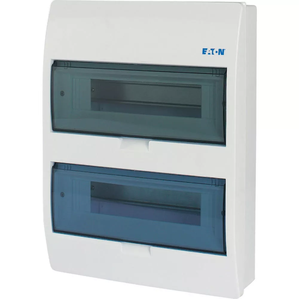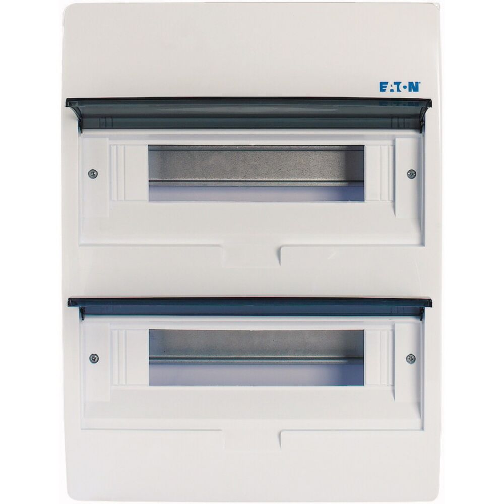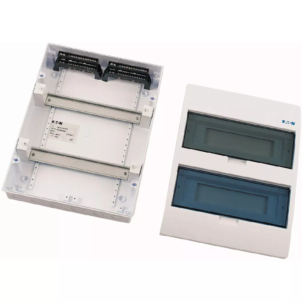 ECO compacte verdeler, opbouw, wit RAL9003, IP40 beschermingsgraad volgens IEC/EN 62208, 12 module-units, 2 rijen, beschermingsklasse 2, volledig geïsoleerd, goedgekeurd voor installatieverdeler voor gebouwen conform IEC/EN 61439-3 VDE 0660-600-3, behuizing volledig gemaakt van ABS, voor het installeren van schakel- en beveiligingscomponenten, in overeenstemming met afmetingenstandaard DIN 43 880, met een installatiediepte van 70 mm, AC 400 V, RoHS-conform, bestaande uit een kunststof basis met een DIN-rail van verzinkt plaatstaal, vingeraanrakingsveilige IP2X nulgeleider- en aardklemmen