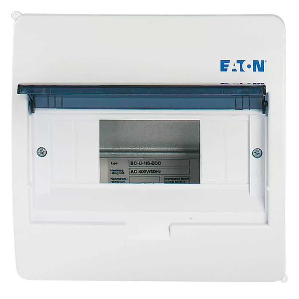 ECO compacte verdeler, inbouw, wit RAL9003, IP40 beschermingsgraad volgens IEC/EN 62208, 8 module-units, 1-rij, beschermingsklasse 2, volledig geïsoleerd, goedgekeurd voor installatieverdeler voor gebouwen conform IEC/EN 61439-3 VDE 0660-600-3, behuizing volledig gemaakt van ABS, voor het installeren van schakel- en beveiligingscomponenten, in overeenstemming met afmetingenstandaard DIN 43 880, met een installatiediepte van 70 mm, AC 400 V, RoHS-conform, bestaande uit een kunststof basis met een DIN-rail van verzinkt plaatstaal, vingeraanrakingsveilige IP2X nulgeleider- en aardklemmen