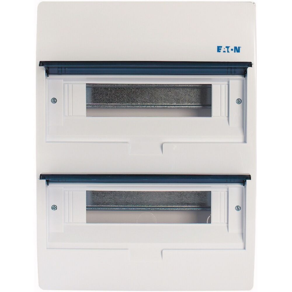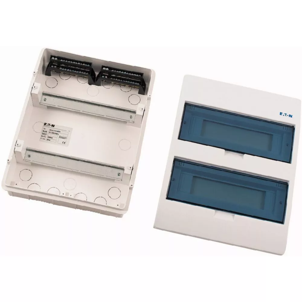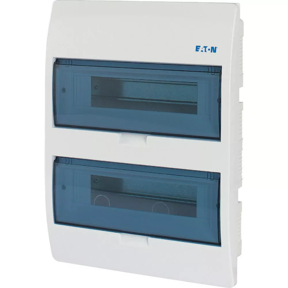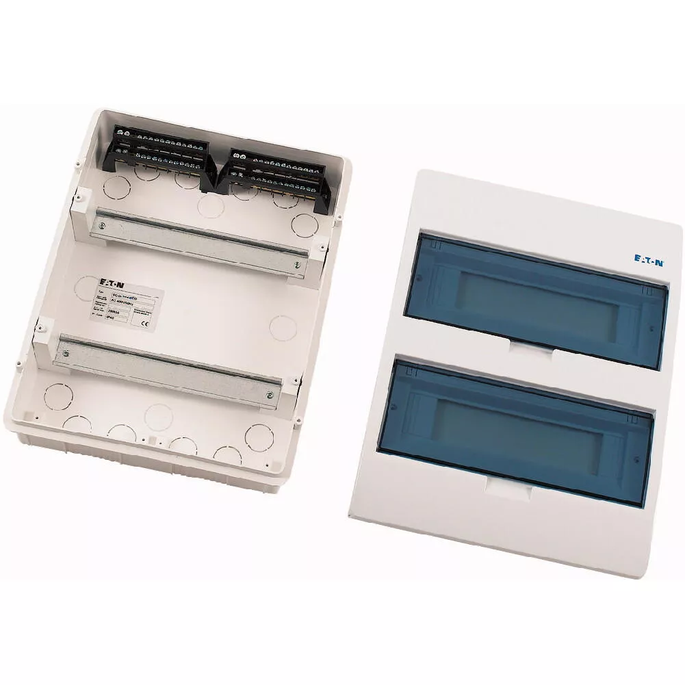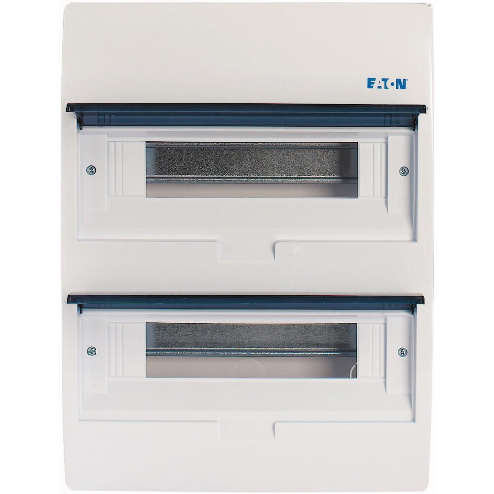 ECO compacte verdeler, inbouw, wit RAL9003, IP40 beschermingsgraad volgens IEC/EN 62208, 12 module-units, 2 rijen, beschermingsklasse 2, volledig geïsoleerd, goedgekeurd voor installatieverdeler voor gebouwen conform IEC/EN 61439-3 VDE 0660-600-3, behuizing volledig gemaakt van ABS, voor het installeren van schakel- en beveiligingscomponenten, in overeenstemming met afmetingenstandaard DIN 43 880, met een installatiediepte van 70 mm, AC 400 V, RoHS-conform, bestaande uit een kunststof basis met een DIN-rail van verzinkt plaatstaal, vingeraanrakingsveilige IP2X nulgeleider- en aardklemmen
