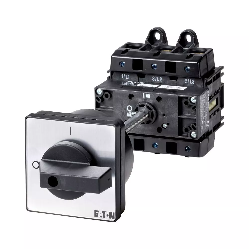 Przełącznik wł.-wył., Zacisk śrubowy: Przełącznik wł.-wył., Odniesienie grupy części P5, z czarnym pokrętłem z tabliczką czołową, Informacje dotyczące dostarczonego sprzętu: Styk pomocniczy lub przewód neutralny montowany przez użytkownika., 3-biegunowy, Stopień ochrony: Przód IP65, Projekt: montaż na panelu tylnym, Moc znamionowa AC-23A, 50 - 60 Hz 400 V: P = 55 kW, Znamionowy prąd ciągły: Iu = 160 A, Normy: IEC/EN 60947, VDE 0660, IEC/EN 60204, CSA, UL, Rozłącznik izolacyjny zgodnie z normą IEC/EN 60947-3