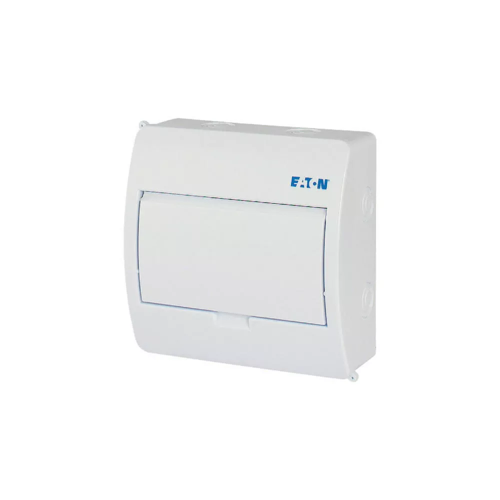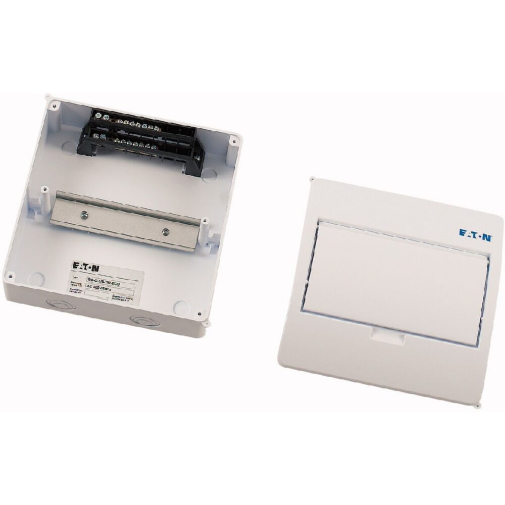 ECO compacte verdeler, opbouw, wit RAL9003, IP40 beschermingsgraad volgens IEC/EN 62208, 8 module-units, 1-rij, beschermingsklasse 2, volledig geïsoleerd, goedgekeurd voor installatieverdeler voor gebouwen conform IEC/EN 61439-3 VDE 0660-600-3, behuizing volledig gemaakt van ABS, voor het installeren van schakel- en beveiligingscomponenten, in overeenstemming met afmetingenstandaard DIN 43 880, met een installatiediepte van 70 mm, AC 400 V, RoHS-conform, bestaande uit een kunststof basis met een DIN-rail van verzinkt plaatstaal, vingeraanrakingsveilige IP2X nulgeleider- en aardklemmen