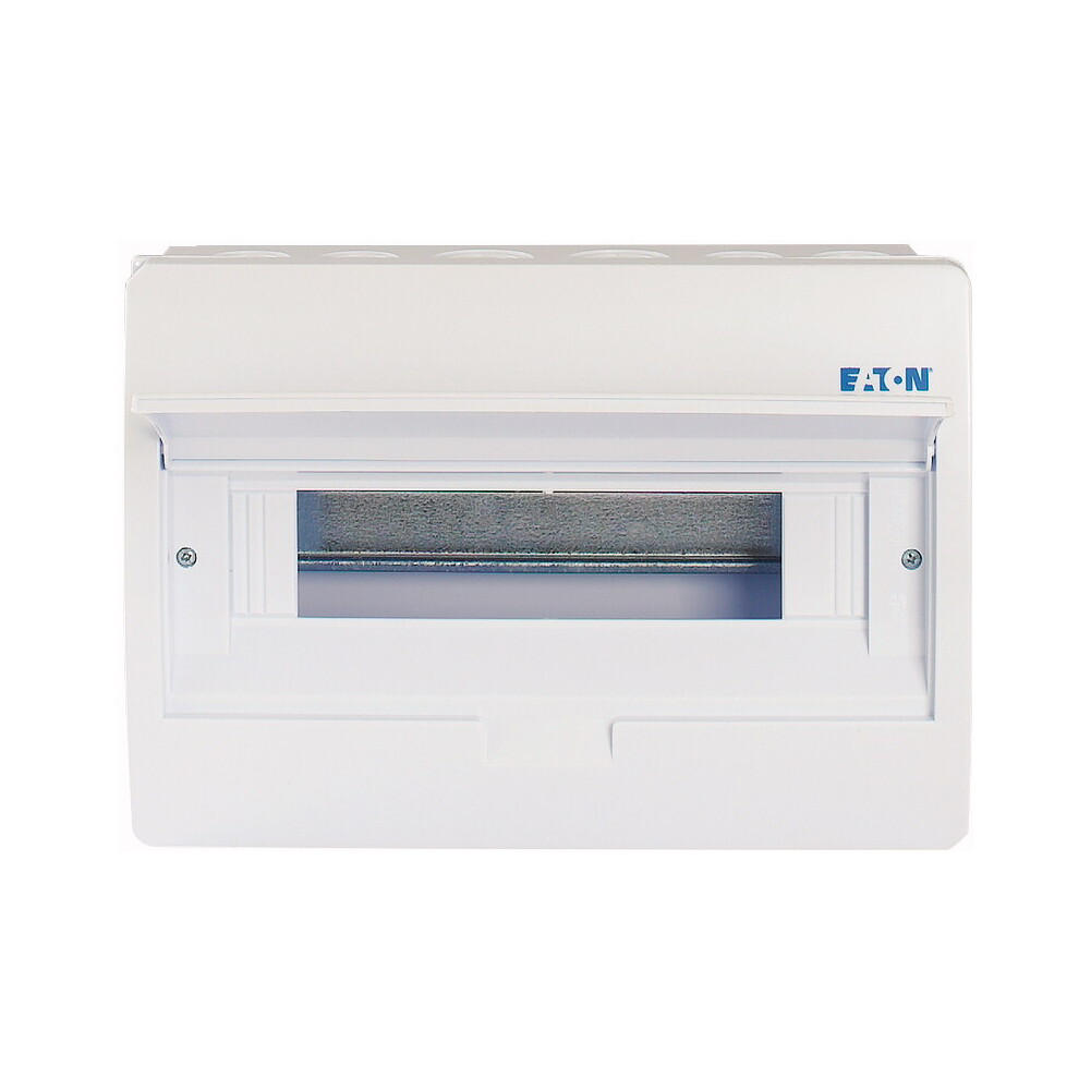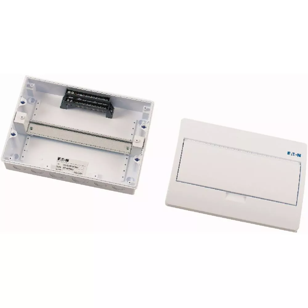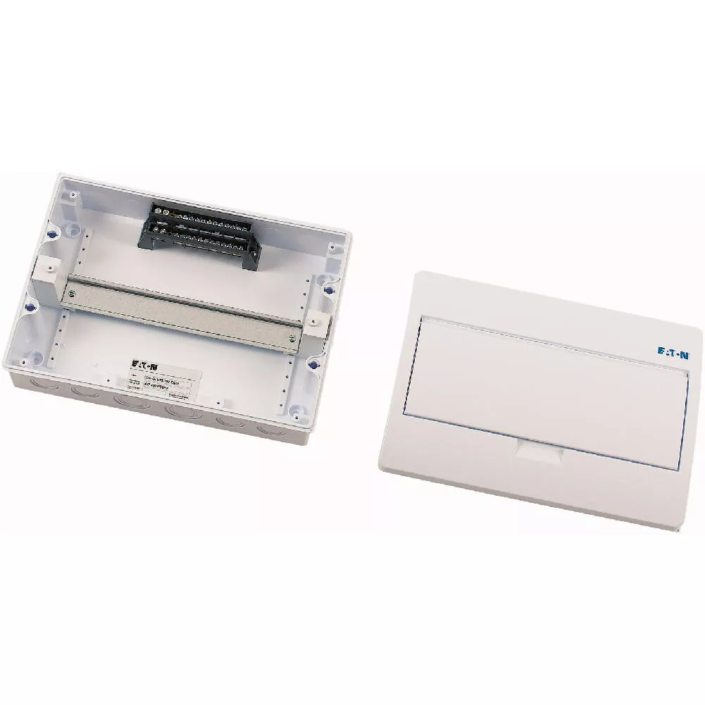 ECO compacte verdeler, opbouw, wit RAL9003, IP40 beschermingsgraad volgens IEC/EN 62208, 12 module-units, 1-rij, beschermingsklasse 2, volledig geïsoleerd, goedgekeurd voor installatieverdeler voor gebouwen conform IEC/EN 61439-3 VDE 0660-600-3, behuizing volledig gemaakt van ABS, voor het installeren van schakel- en beveiligingscomponenten, in overeenstemming met afmetingenstandaard DIN 43 880, met een installatiediepte van 70 mm, AC 400 V, RoHS-conform, bestaande uit een kunststof basis met een DIN-rail van verzinkt plaatstaal, vingeraanrakingsveilige IP2X nulgeleider- en aardklemmen