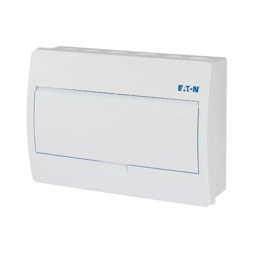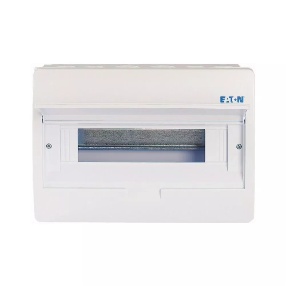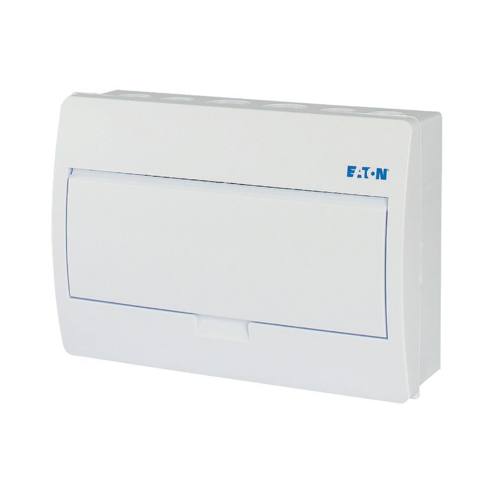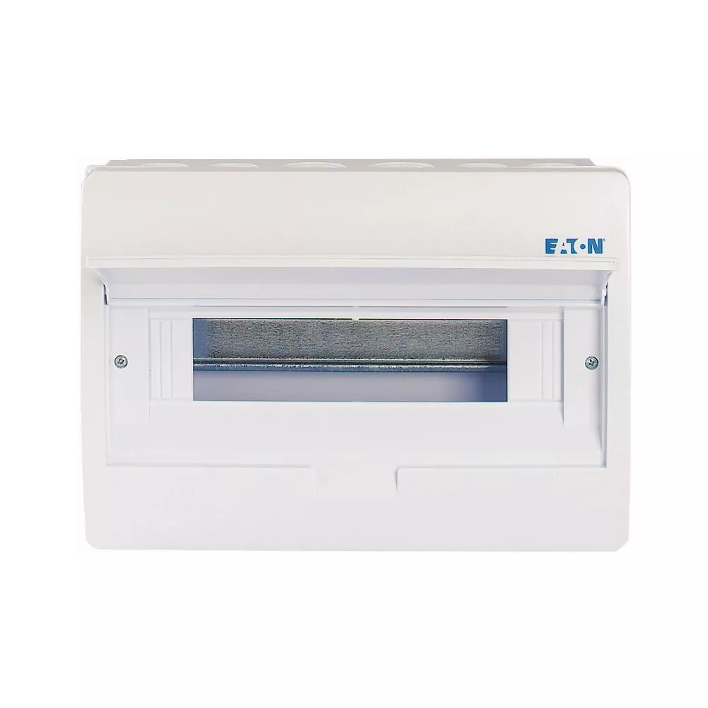 ECO compacte verdeler, opbouw, wit RAL9003, IP40 beschermingsgraad volgens IEC/EN 62208, 12 module-units, 1-rij, beschermingsklasse 2, volledig geïsoleerd, goedgekeurd voor installatieverdeler voor gebouwen conform IEC/EN 61439-3 VDE 0660-600-3, behuizing volledig gemaakt van ABS, voor het installeren van schakel- en beveiligingscomponenten, in overeenstemming met afmetingenstandaard DIN 43 880, met een installatiediepte van 70 mm, AC 400 V, RoHS-conform, bestaande uit een kunststof basis met een DIN-rail van verzinkt plaatstaal, vingeraanrakingsveilige IP2X nulgeleider- en aardklemmen