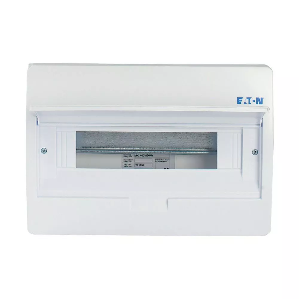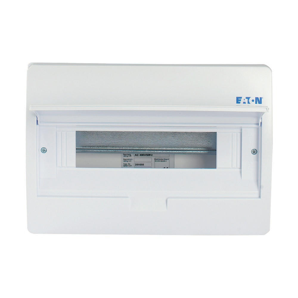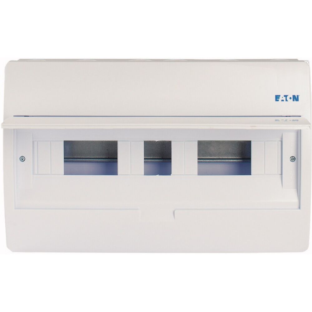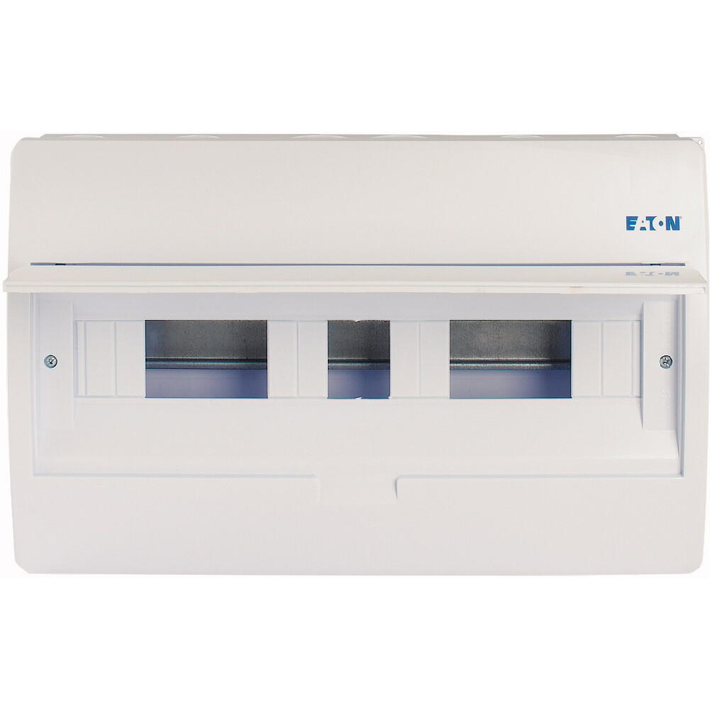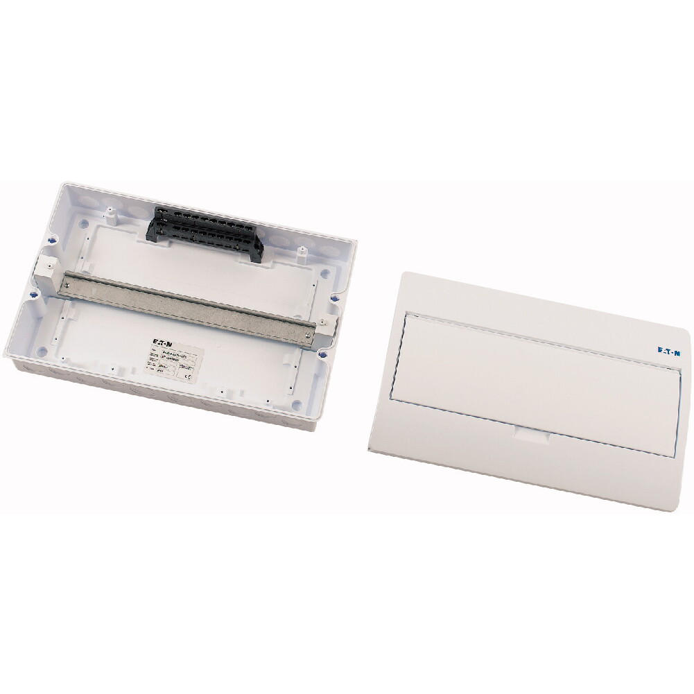 ECO compacte verdeler, opbouw, wit RAL9003, IP40 beschermingsgraad volgens IEC/EN 62208, 18 module-units, 1-rij, beschermingsklasse 2, volledig geïsoleerd, goedgekeurd voor installatieverdeler voor gebouwen conform IEC/EN 61439-3 VDE 0660-600-3, behuizing volledig gemaakt van ABS, voor het installeren van schakel- en beveiligingscomponenten, in overeenstemming met afmetingenstandaard DIN 43 880, met een installatiediepte van 70 mm, AC 400 V, RoHS-conform, bestaande uit een kunststof basis met een DIN-rail van verzinkt plaatstaal, vingeraanrakingsveilige IP2X nulgeleider- en aardklemmen