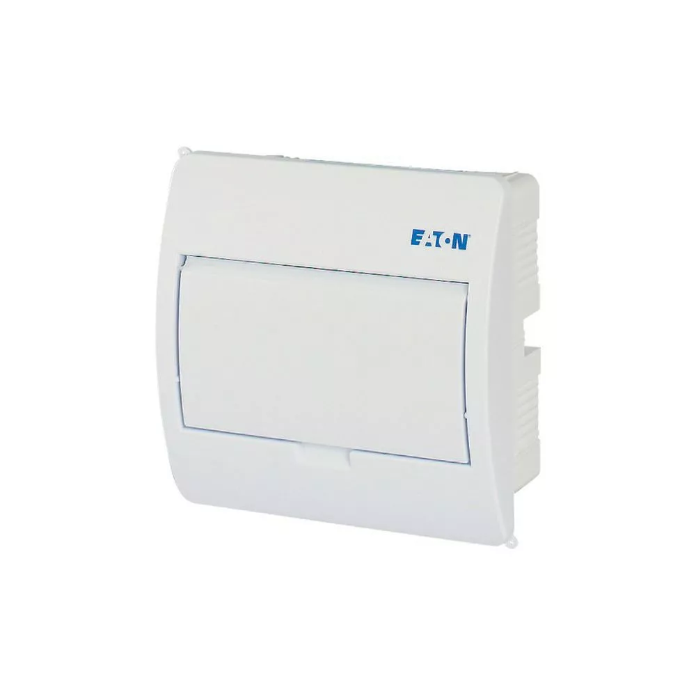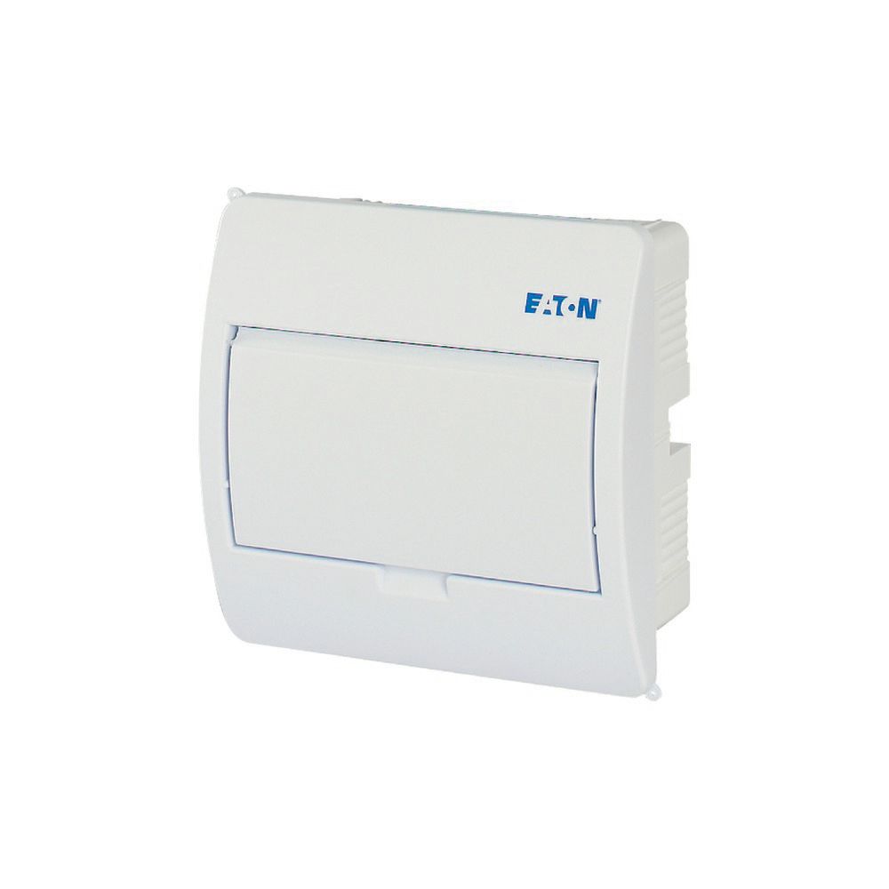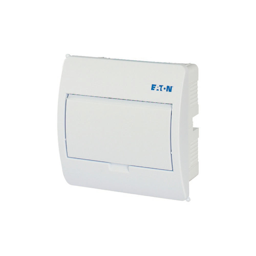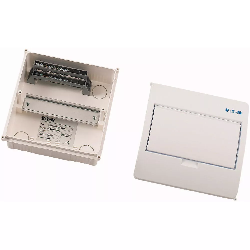 ECO compacte verdeler, inbouw, wit RAL9003, IP40 beschermingsgraad volgens IEC/EN 62208, 8 module-units, 1-rij, beschermingsklasse 2, volledig geïsoleerd, goedgekeurd voor installatieverdeler voor gebouwen conform IEC/EN 61439-3 VDE 0660-600-3, behuizing volledig gemaakt van ABS, voor het installeren van schakel- en beveiligingscomponenten, in overeenstemming met afmetingenstandaard DIN 43 880, met een installatiediepte van 70 mm, AC 400 V, RoHS-conform, bestaande uit een kunststof basis met een DIN-rail van verzinkt plaatstaal, vingeraanrakingsveilige IP2X nulgeleider- en aardklemmen