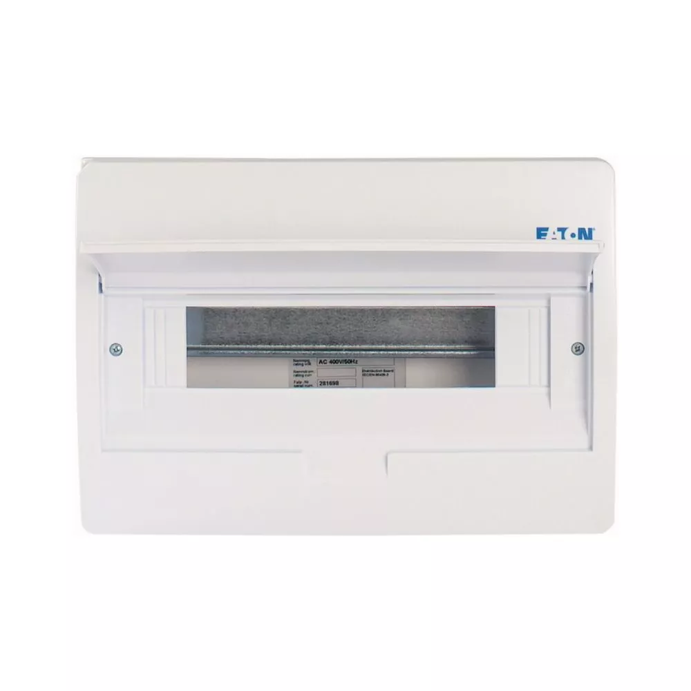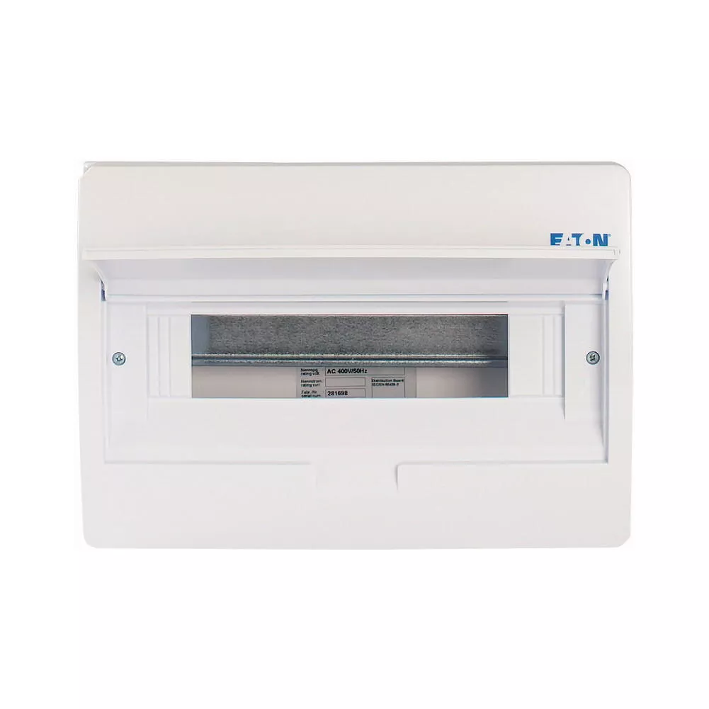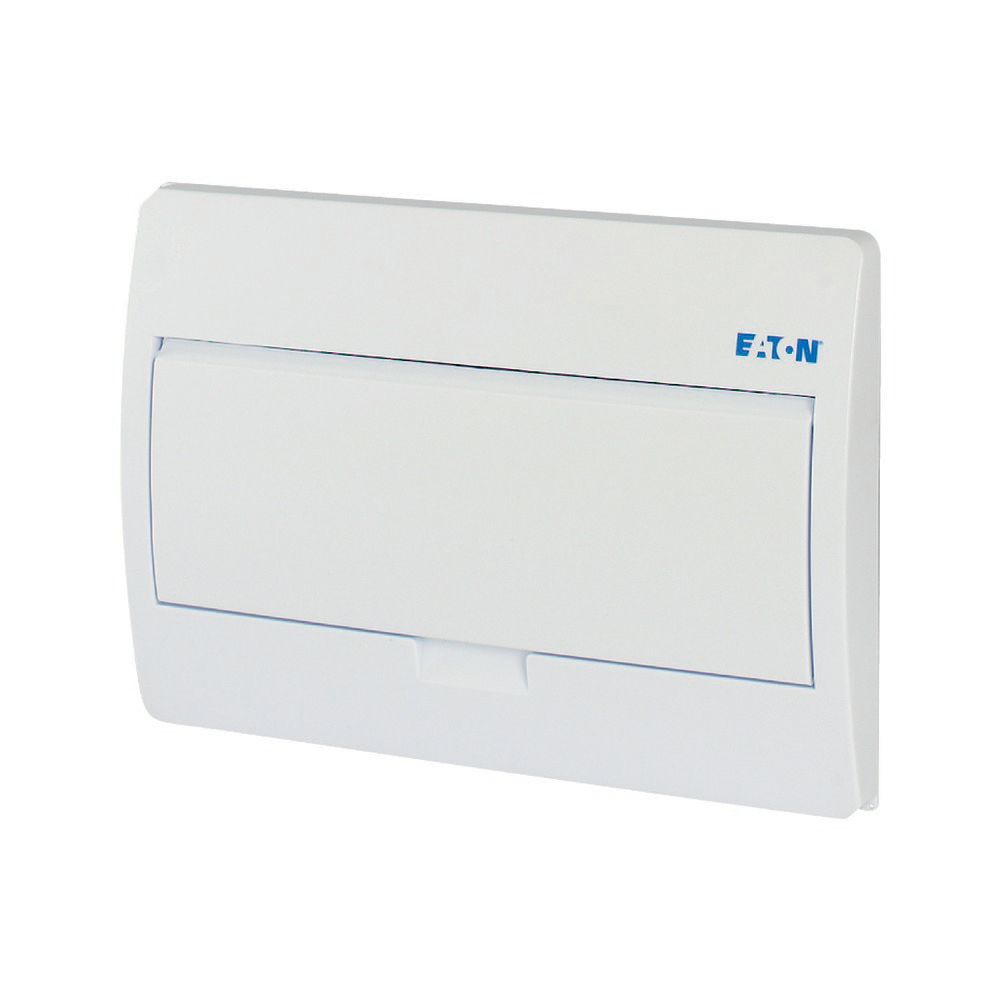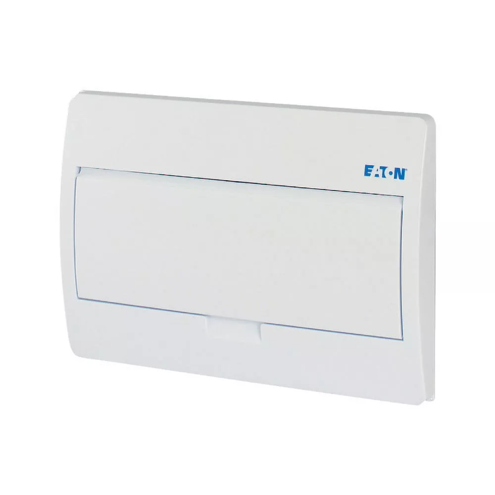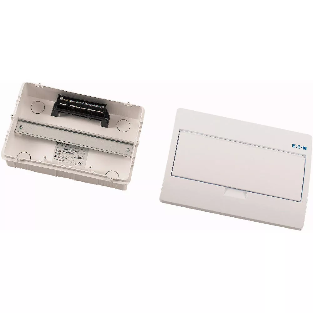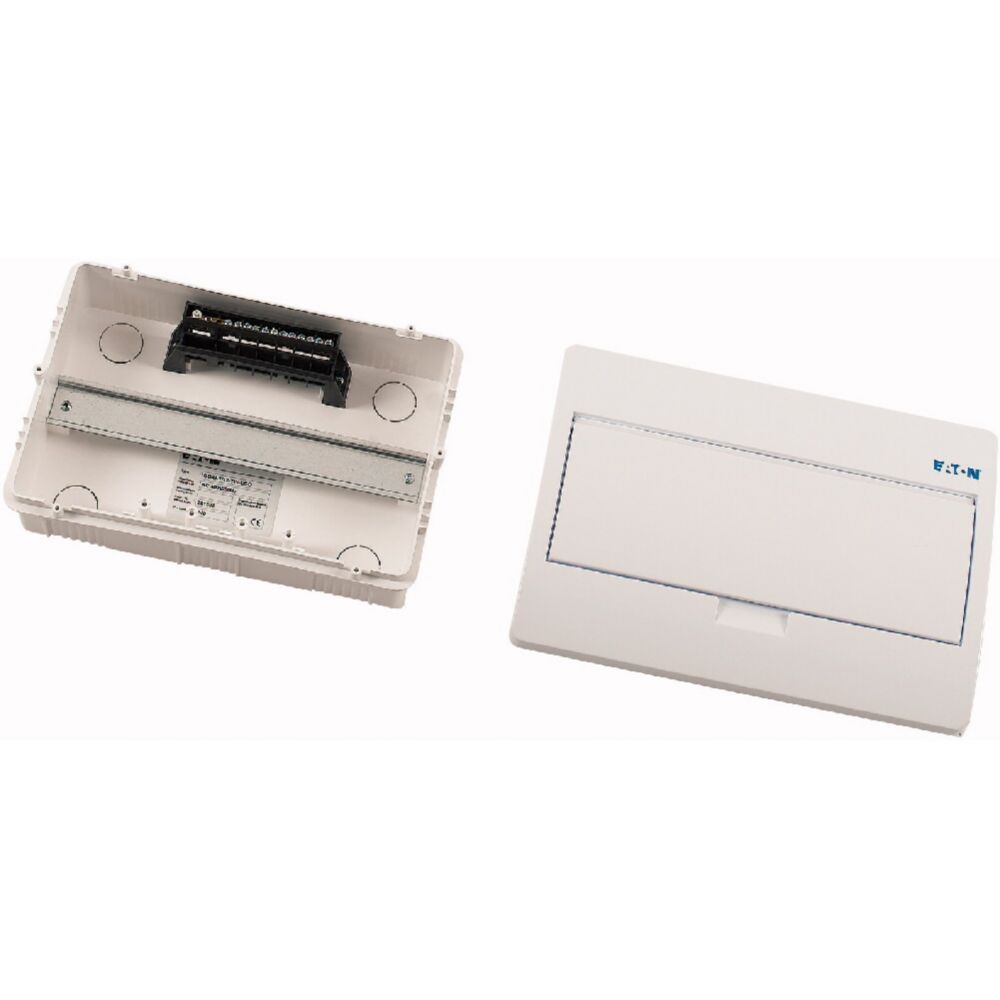 ECO compacte verdeler, inbouw, wit RAL9003, IP40 beschermingsgraad volgens IEC/EN 62208, 12 module-units, 1-rij, beschermingsklasse 2, volledig geïsoleerd, goedgekeurd voor installatieverdeler voor gebouwen conform IEC/EN 61439-3 VDE 0660-600-3, behuizing volledig gemaakt van ABS, voor het installeren van schakel- en beveiligingscomponenten, in overeenstemming met afmetingenstandaard DIN 43 880, met een installatiediepte van 70 mm, AC 400 V, RoHS-conform, bestaande uit een kunststof basis met een DIN-rail van verzinkt plaatstaal, vingeraanrakingsveilige IP2X nulgeleider- en aardklemmen