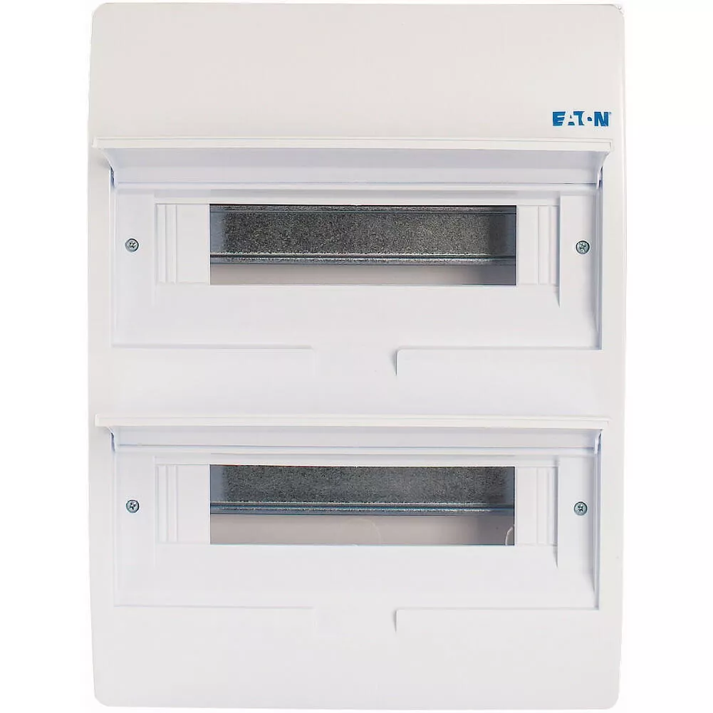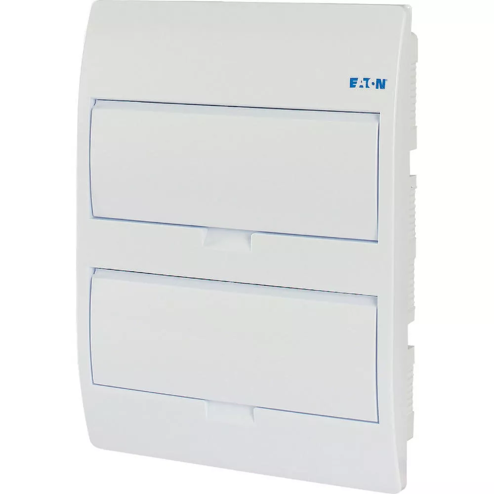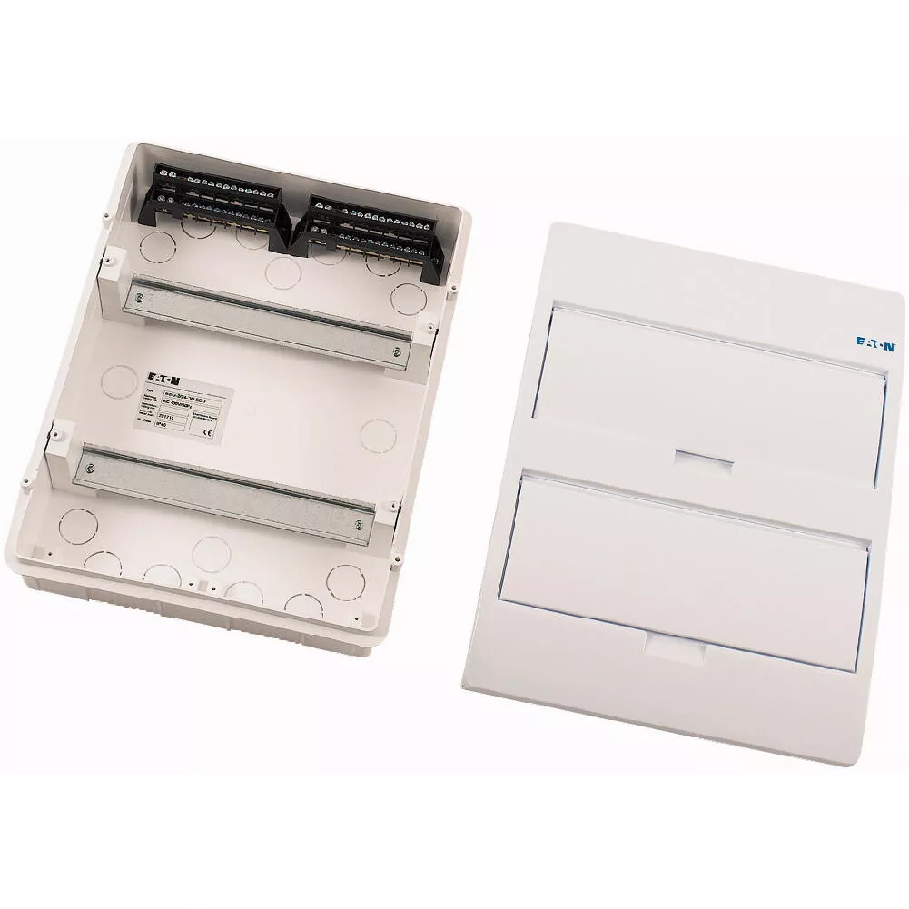 ECO compacte verdeler, inbouw, wit RAL9003, IP40 beschermingsgraad volgens IEC/EN 62208, 12 module-units, 2 rijen, beschermingsklasse 2, volledig geïsoleerd, goedgekeurd voor installatieverdeler voor gebouwen conform IEC/EN 61439-3 VDE 0660-600-3, behuizing volledig gemaakt van ABS, voor het installeren van schakel- en beveiligingscomponenten, in overeenstemming met afmetingenstandaard DIN 43 880, met een installatiediepte van 70 mm, AC 400 V, RoHS-conform, bestaande uit een kunststof basis met een DIN-rail van verzinkt plaatstaal, vingeraanrakingsveilige IP2X nulgeleider- en aardklemmen