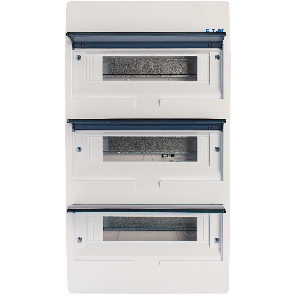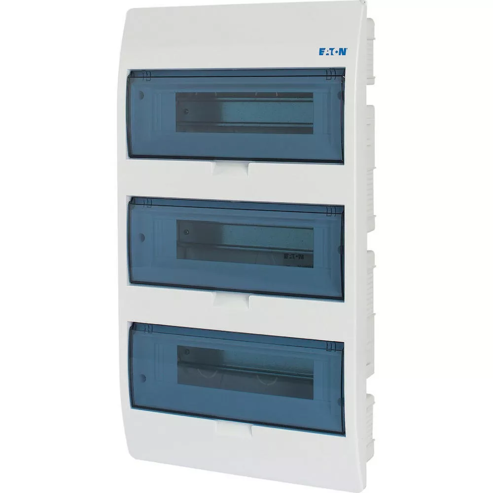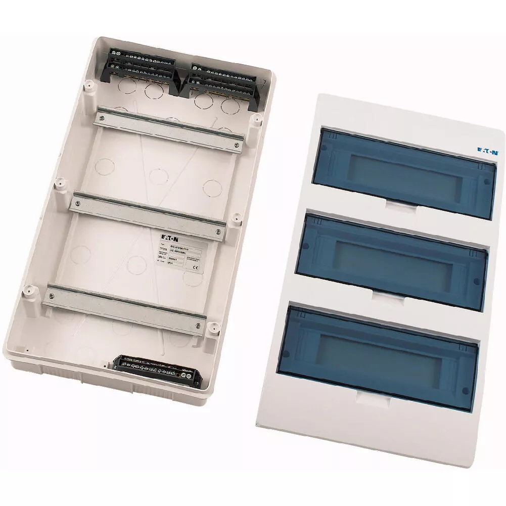 ECO compacte verdeler, inbouw, wit RAL9003, IP40 beschermingsgraad volgens IEC/EN 62208, 12 module-units, 3-rijen, beschermingsklasse 2, volledig geïsoleerd, goedgekeurd voor installatieverdeler voor gebouwen conform IEC/EN 61439-3 VDE 0660-600-3, behuizing volledig gemaakt van ABS, voor het installeren van schakel- en beveiligingscomponenten, in overeenstemming met afmetingenstandaard DIN 43 880, met een installatiediepte van 70 mm, AC 400 V, RoHS-conform, bestaande uit een kunststof basis met een DIN-rail van verzinkt plaatstaal, vingeraanrakingsveilige IP2X nulgeleider- en aardklemmen