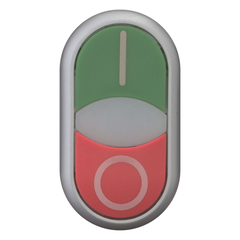 Przycisk podwójny, Zacisk śrubowy: RMQ-Titan, Urządzenie pojedyncze, Projekt: Przycisk uruchamiający I i lampka sygnalizacyjna zlicowane, Przycisk uruchamiający 0 niezlicowany, z samopowrotem, Opis: Biała soczewka, wkładka przycisku: zielony, czerwony, Wkładka przycisku podpisana, Stopień ochrony: IP66, Pierścień czołowy: tytan, Podłączanie do SmartWire-DT: tak, z przyłączami SWD-RMQ, Wymiary przedniej części: 29,7 x 54,7, Normy: IEC/EN 60947, VDE 0660