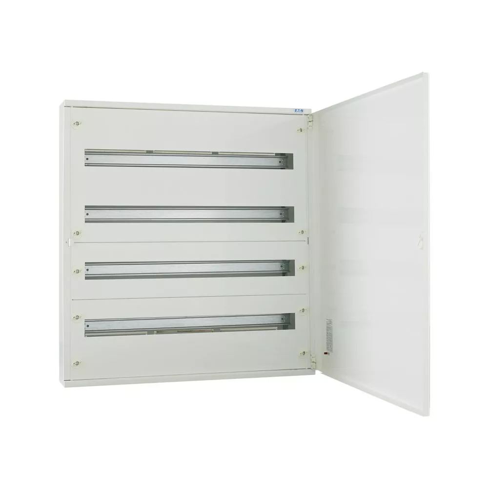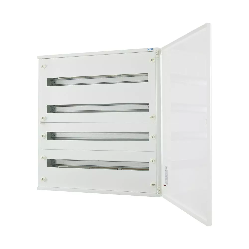 Kompletter BF-O-./..-P Oberputz-Flachverteiler, weiß RAL 9016, 24 Teilungseinheiten pro Reihe, 4-reihig, Höhe 750 mm, Breite 543 mm, Tiefe 140 mm, einschließlich Tür, Frontschilder, DIN-Schienen-Montagerahmen und neutrale/PE-Klemmen. Gehäuse: geschlossenes Design, einschließlich Rückwand, Rückwand als Befestigungsebene nutzbar, 2 Kabeldurchsteckflansche für schlanke Verteiler mit einer Breite von 24 Teilungseinheiten, oben, vorgeprägte Kabeleinführungsöffnungen unten, Klemmen auf Gehäuse vormontiert (kein Verlust von Teilungseinheiten). Mauerwanne mit Türrahmen, Rückwand als Befestigungsebene nutzbar, leicht ausbrechbare Kabeleinführungsöffnungen