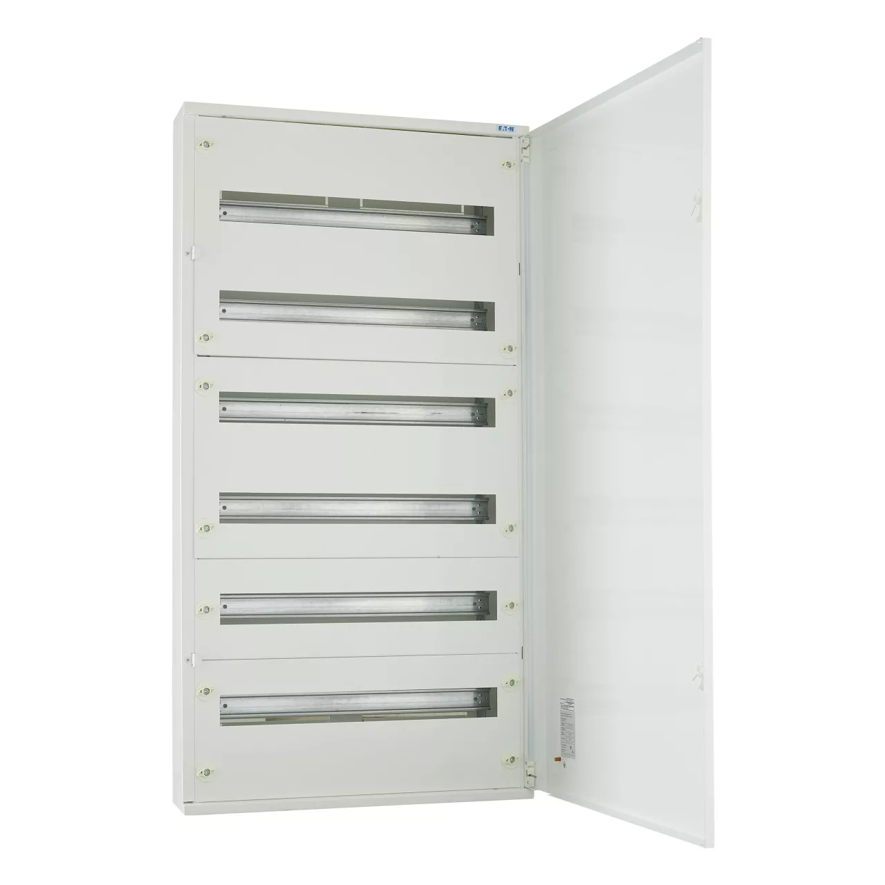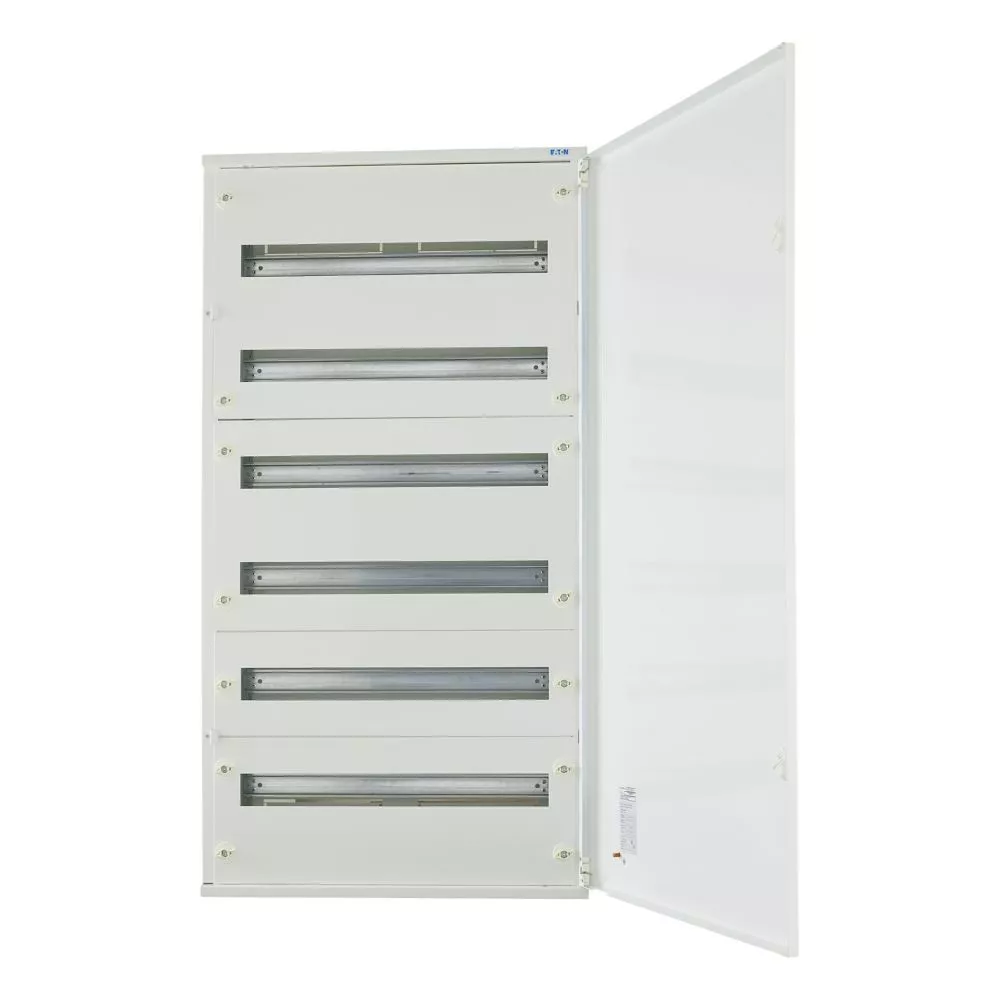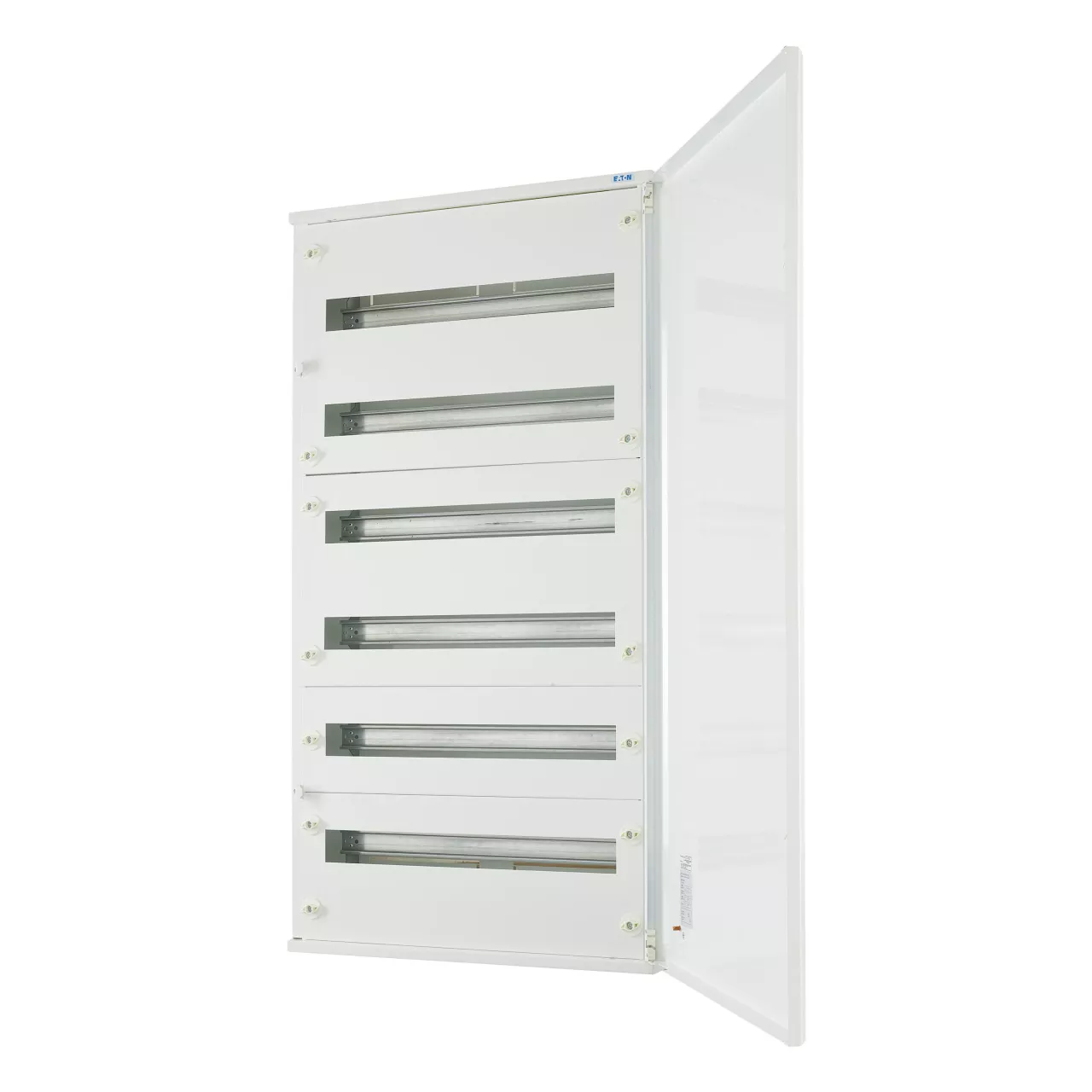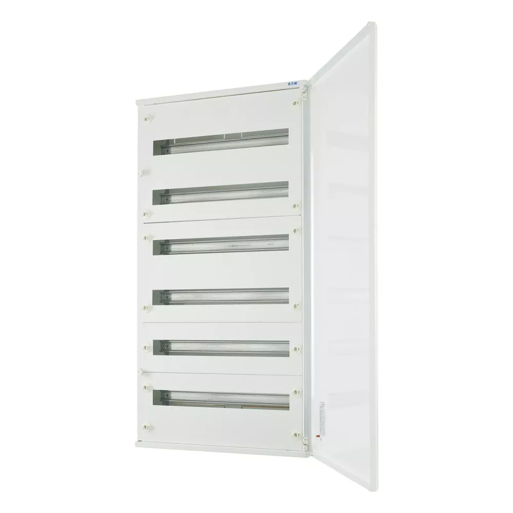 Kompletter BF-O-./..-P Oberputz-Flachverteiler, weiß RAL 9016, 24 Platzeinheiten pro Reihe, 6-reihig, Höhe 1050 mm, Breite 543 mm, Tiefe 140 mm, einschließlich Tür, Frontschilder, DIN-Schienen-Montagerahmen und neutrale/PE-Klemmen. Gehäuse: geschlossenes Design, einschließlich Rückwand, Rückwand als Befestigungsebene nutzbar, 2 Kabeldurchsteckflansche für schlanke Verteiler mit einer Breite von 24 Teilungseinheiten, oben, vorgeprägte Kabeleinführungsöffnungen unten, Klemmen auf Gehäuse vormontiert (kein Verlust von Teilungseinheiten). Mauerwanne mit Türrahmen, Rückwand als Befestigungsebene nutzbar, leicht ausbrechbare Kabeleinführungsöffnungen