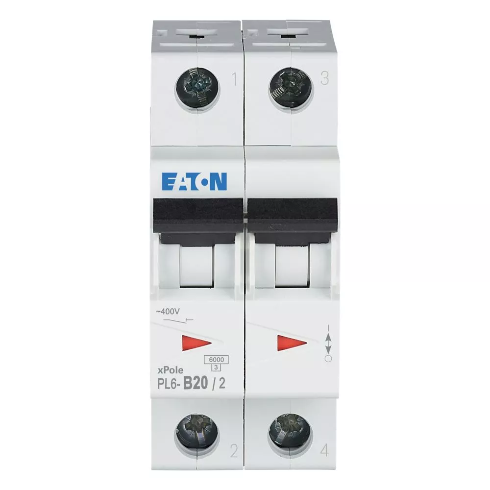 Leitungsschutzschalter (MCB), PL6, 2-polig, Auslösecharakteristik: B, Bemessungsstrom Ein: 20 A, Bemessungsschaltvermögen nach IEC/EN 60898-1: 6 kA, Schaltgeräte für den Wohnungsbereich und kommerzielle Anwendungen