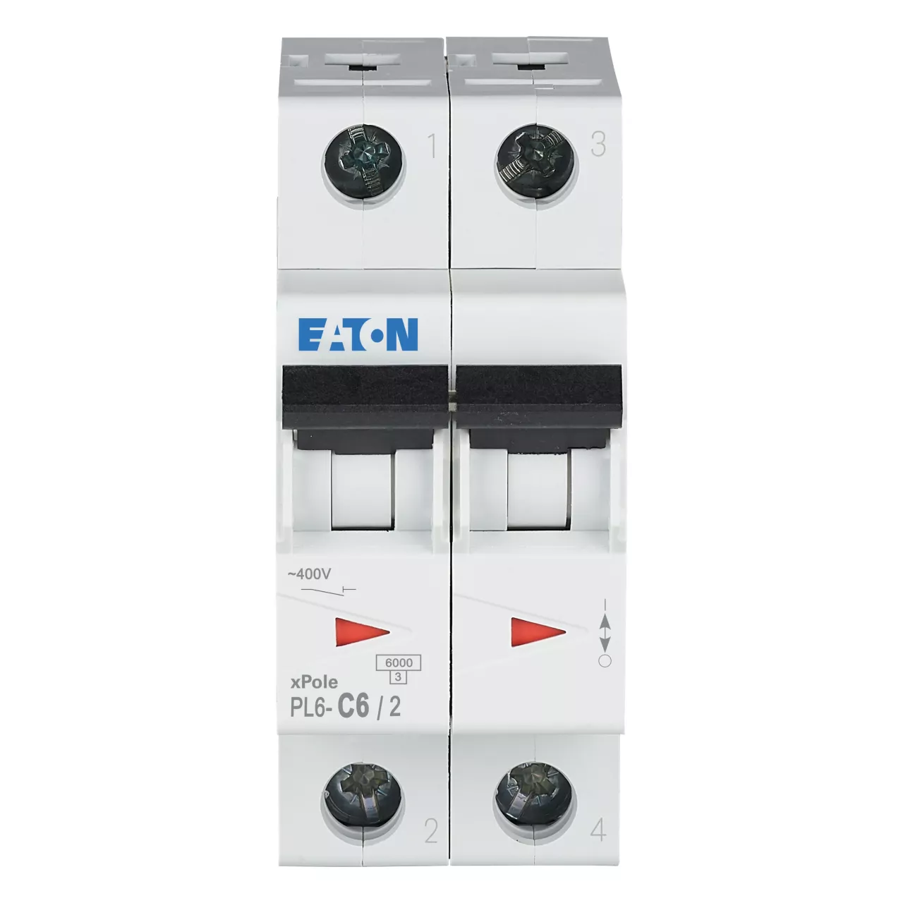 Leitungsschutzschalter (MCB), PL6, 2-polig, Auslösecharakteristik: C, Bemessungsstrom Ein: 6 A, Bemessungsschaltvermögen nach IEC/EN 60898-1: 6 kA, Schaltgeräte für den Wohnungsbereich und kommerzielle Anwendungen