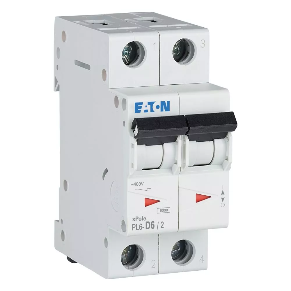 Leitungsschutzschalter (MCB), PL6, 2-polig, Auslösecharakteristik: D, Bemessungsstrom Ein: 6 A, Bemessungsschaltvermögen nach IEC/EN 60898-1: 6 kA, Schaltgeräte für den Wohnungsbereich und kommerzielle Anwendungen