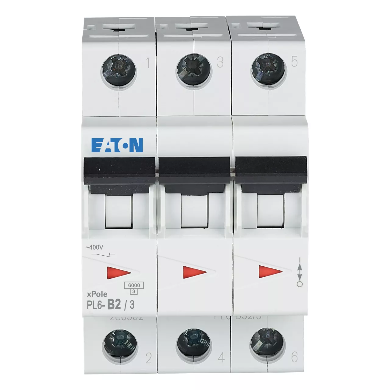 Leitungsschutzschalter (MCB), PL6, 3-polig, Auslösecharakteristik: B, Bemessungsstrom Ein: 2 A, Bemessungsschaltvermögen nach IEC/EN 60898-1: 6 kA, Schaltgeräte für den Wohnungsbereich und kommerzielle Anwendungen