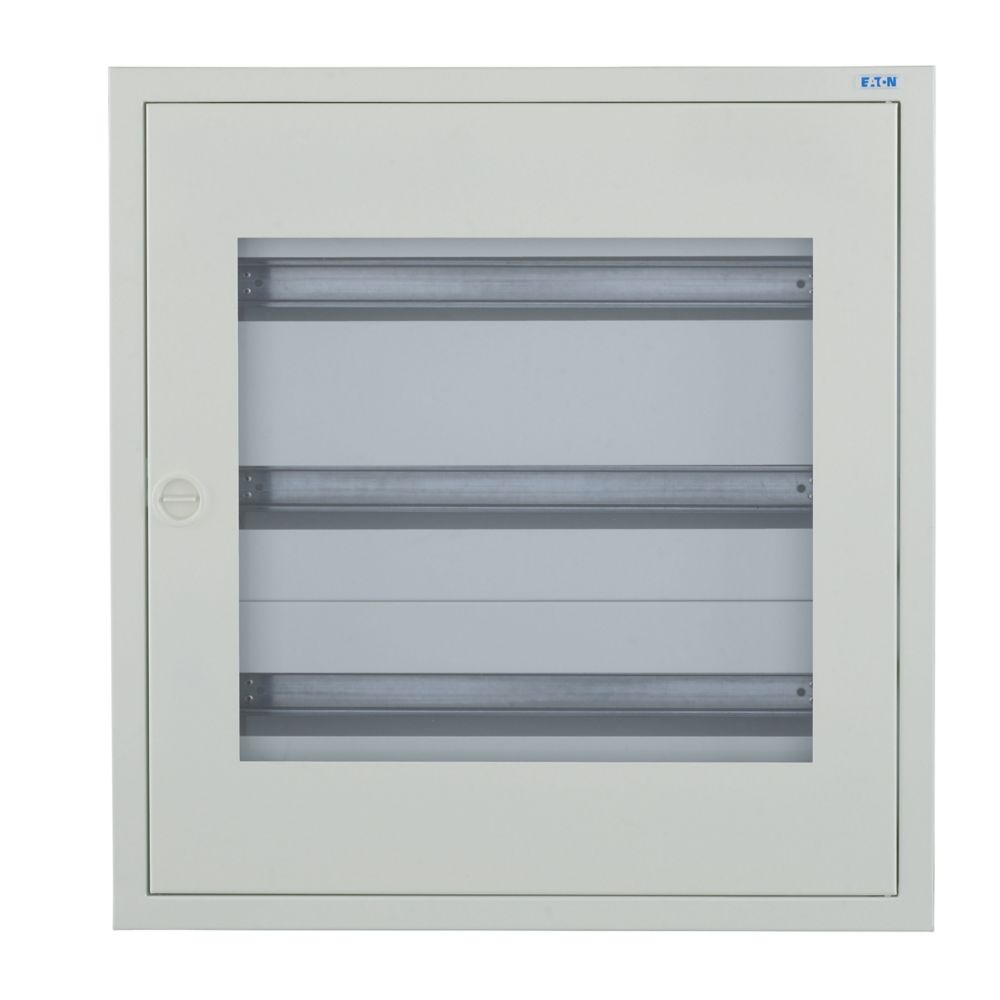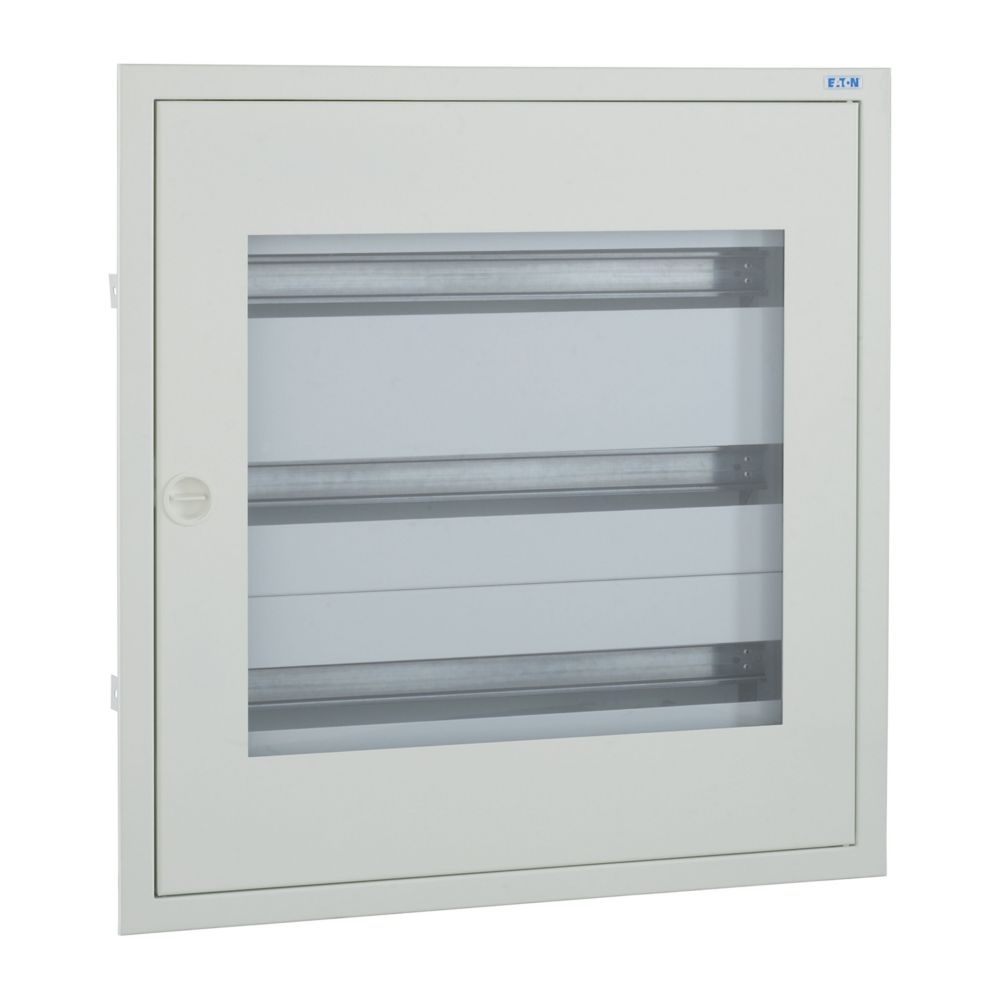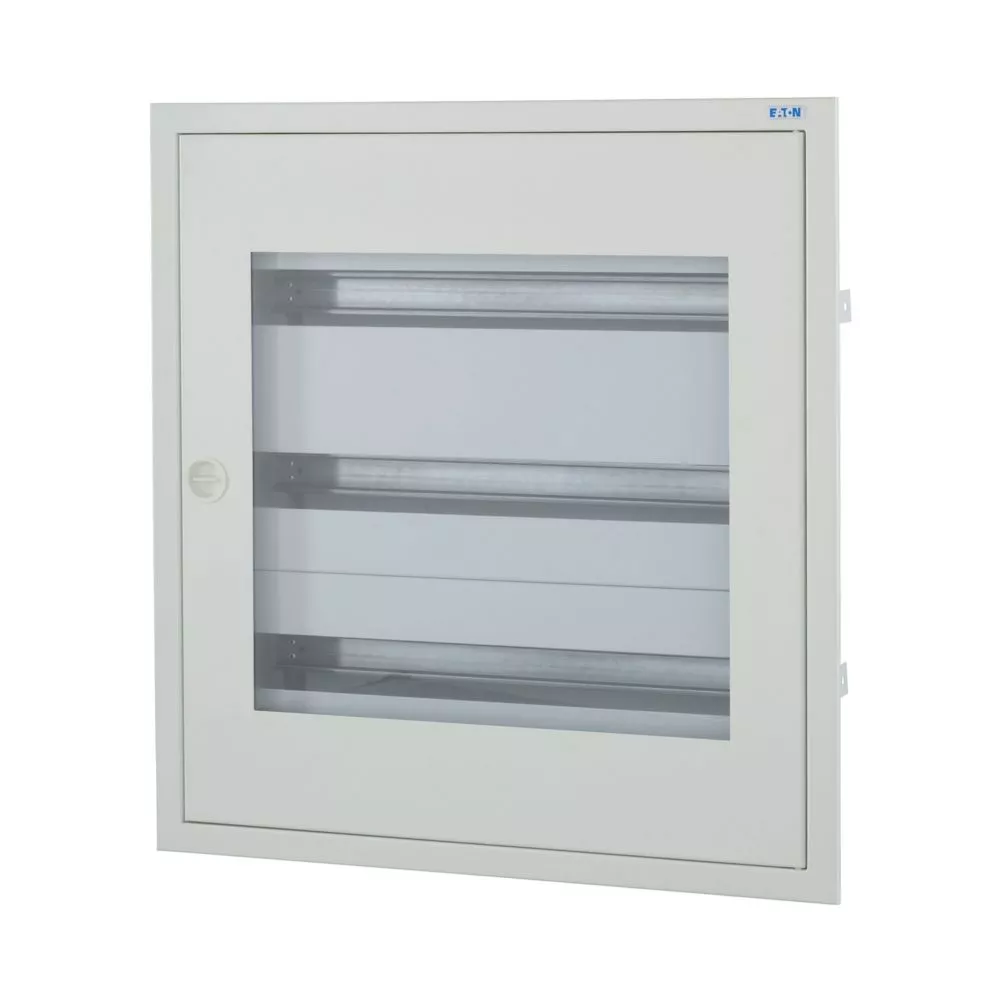 Kompletter BF-U-./..-P Unterputz-Stromverteiler, weiß RAL 9016, 24 Platzeinheiten pro Reihe, 3-reihig, Höhe 620 mm, Breite 588 mm, Tiefe 136 mm, einschließlich Tür und Sichtfenster, Frontschilder, DIN-Schienen-Montagerahmen und neutrale/PE-Klemmen. Gehäuse: geschlossenes Design, einschließlich Rückwand, Rückwand als Befestigungsebene nutzbar, 2 Kabeldurchsteckflansche für schlanke Verteiler mit einer Breite von 24 Teilungseinheiten, oben, vorgeprägte Kabeleinführungsöffnungen unten, Klemmen auf Gehäuse vormontiert (kein Verlust von Teilungseinheiten). Mauerwanne mit Türrahmen, Rückwand als Befestigungsebene nutzbar