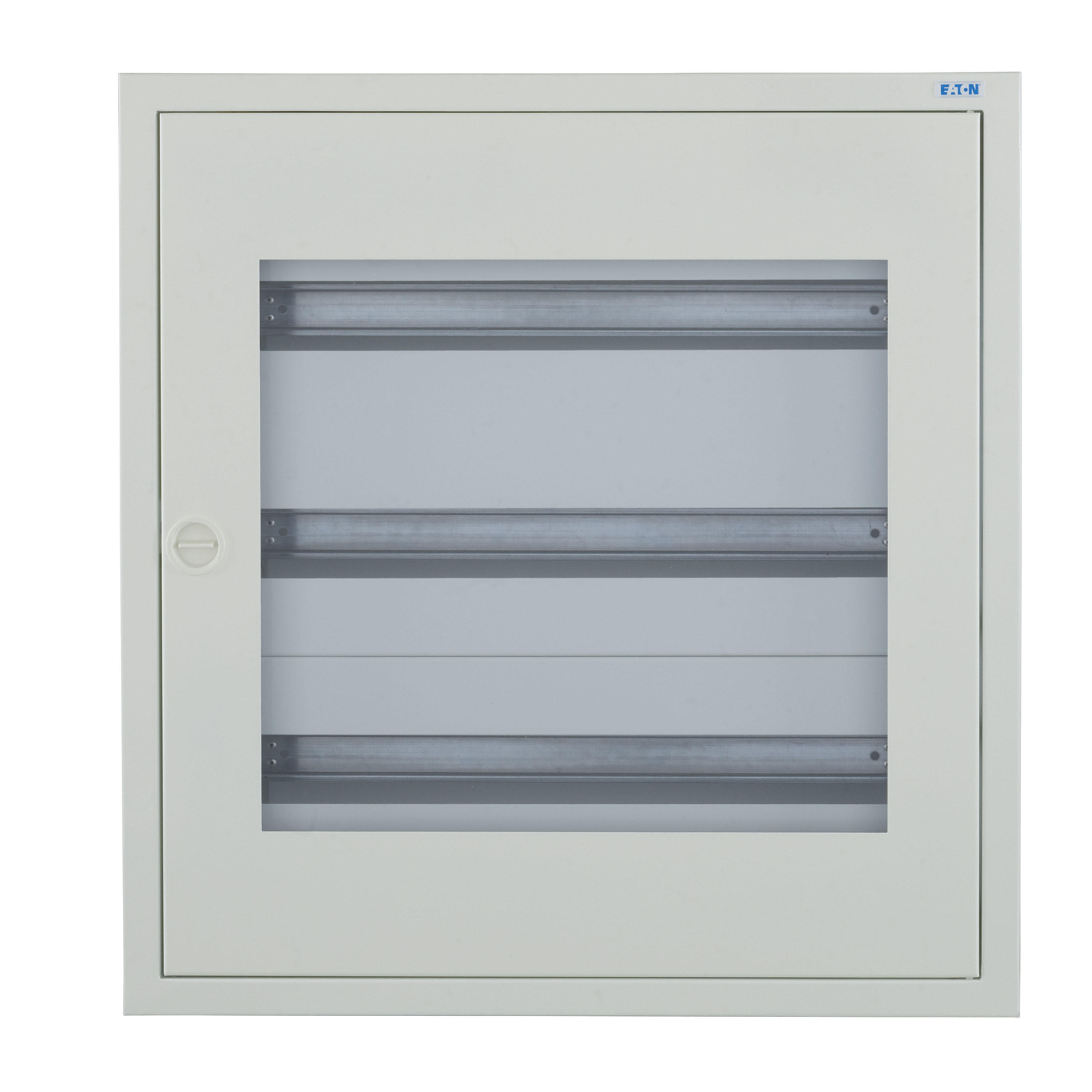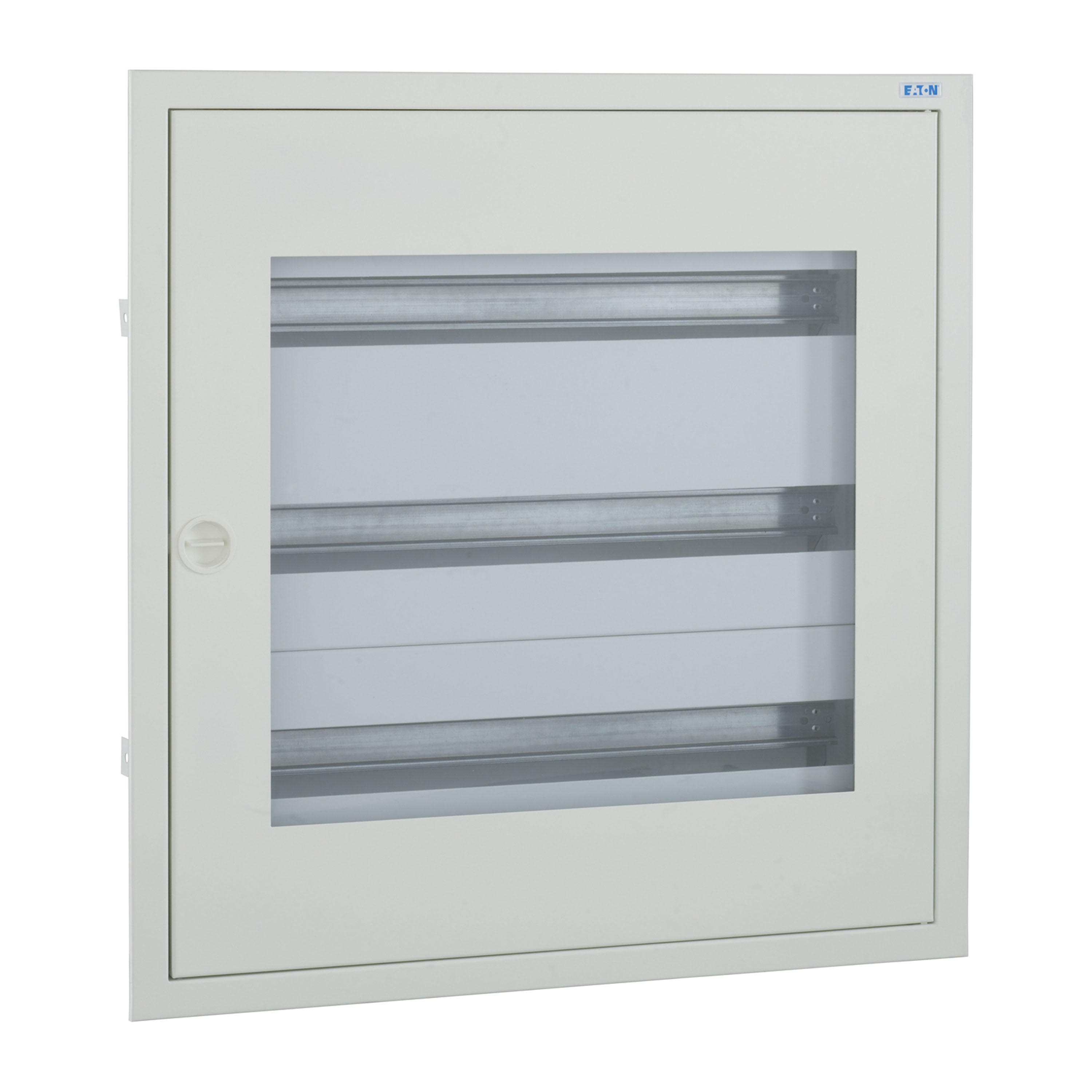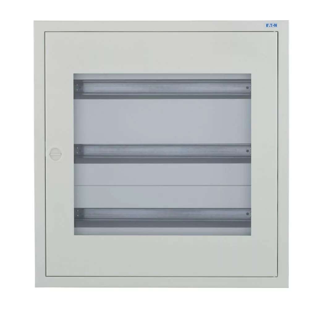 Kompletter BF-U-./..-P Unterputz-Stromverteiler, weiß RAL 9016, 24 Platzeinheiten pro Reihe, 3-reihig, Höhe 620 mm, Breite 588 mm, Tiefe 136 mm, einschließlich Tür und Sichtfenster, Frontschilder, DIN-Schienen-Montagerahmen und neutrale/PE-Klemmen. Gehäuse: geschlossenes Design, einschließlich Rückwand, Rückwand als Befestigungsebene nutzbar, 2 Kabeldurchsteckflansche für schlanke Verteiler mit einer Breite von 24 Teilungseinheiten, oben, vorgeprägte Kabeleinführungsöffnungen unten, Klemmen auf Gehäuse vormontiert (kein Verlust von Teilungseinheiten). Mauerwanne mit Türrahmen, Rückwand als Befestigungsebene nutzbar