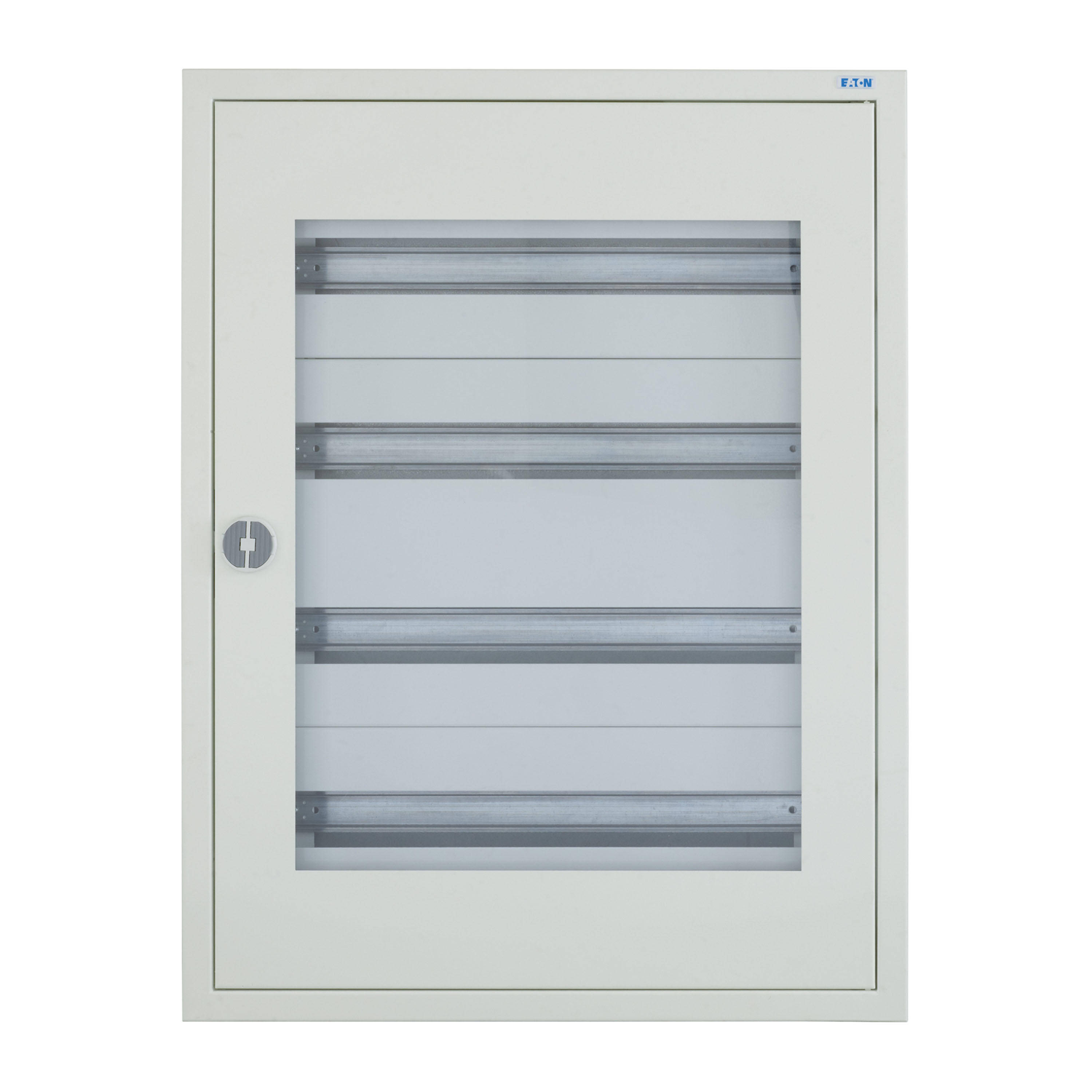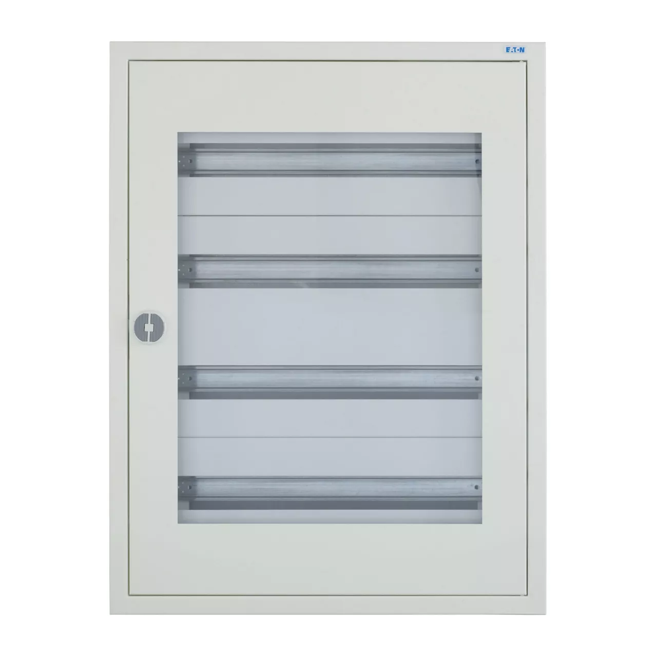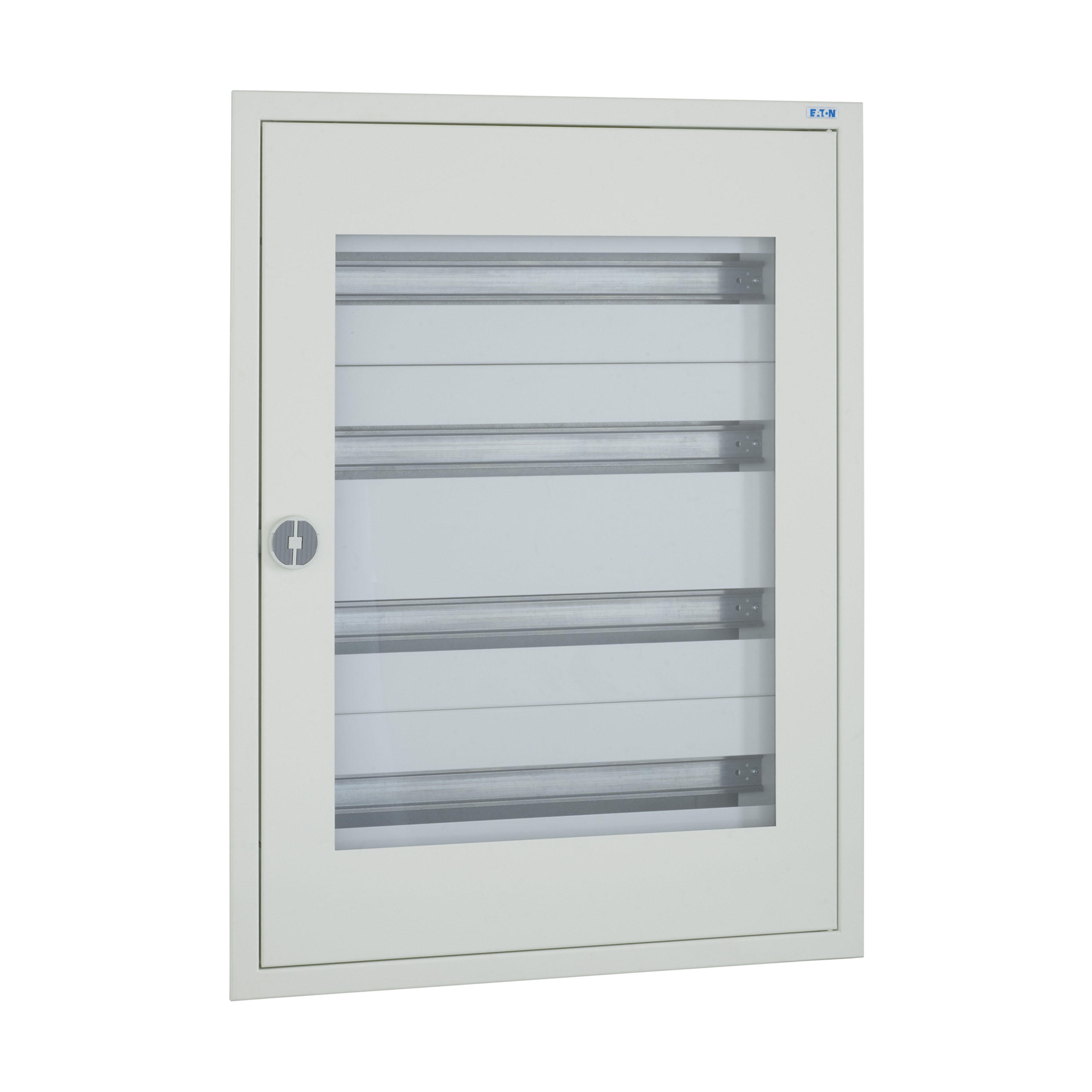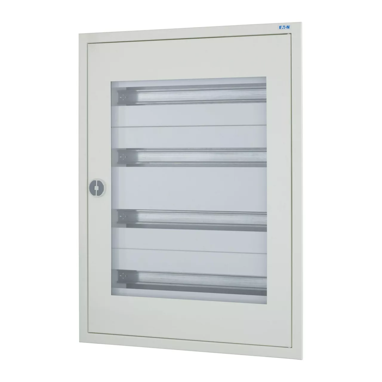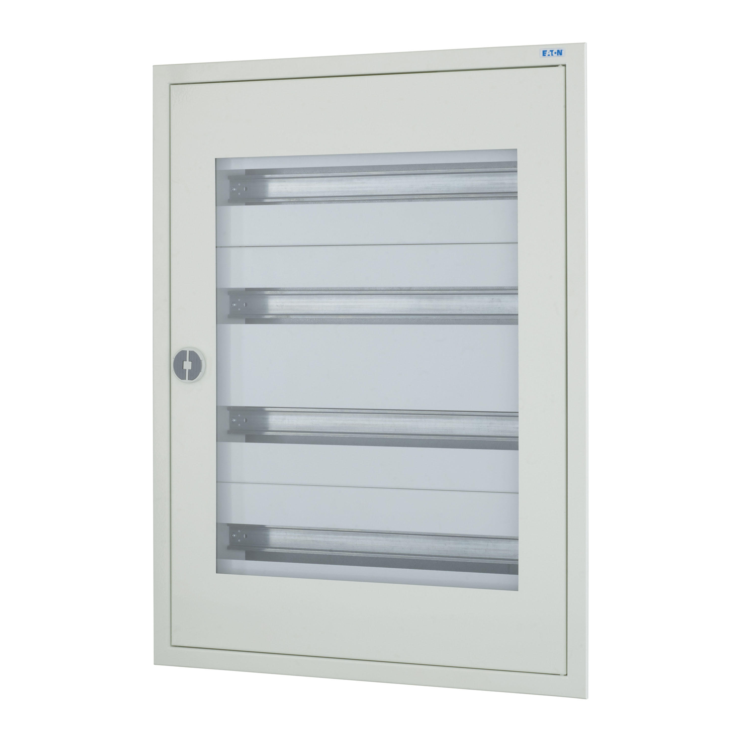 Kompletter BF-U-./..-P Unterputz-Stromverteiler, weiß RAL 9016, 24 Platzeinheiten pro Reihe, 4-reihig, Höhe 770 mm, Breite 588 mm, Tiefe 136 mm, einschließlich Tür und Sichtfenster, Frontschilder, DIN-Schienen-Montagerahmen und neutrale/PE-Klemmen. Gehäuse: geschlossenes Design, einschließlich Rückwand, Rückwand als Befestigungsebene nutzbar, 2 Kabeldurchsteckflansche für schlanke Verteiler mit einer Breite von 24 Teilungseinheiten, oben, vorgeprägte Kabeleinführungsöffnungen unten, Klemmen auf Gehäuse vormontiert (kein Verlust von Teilungseinheiten). Mauerwanne mit Türrahmen, Rückwand als Befestigungsebene nutzbar