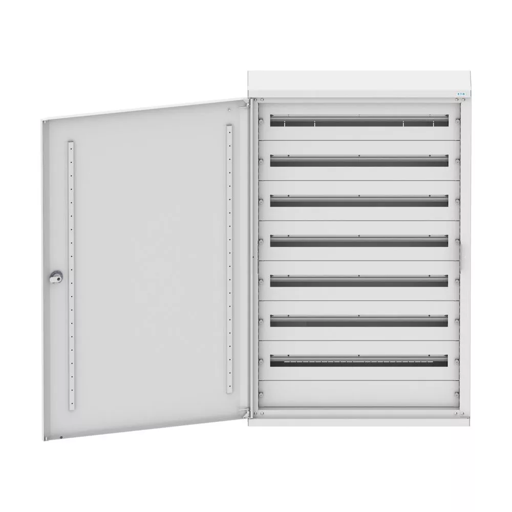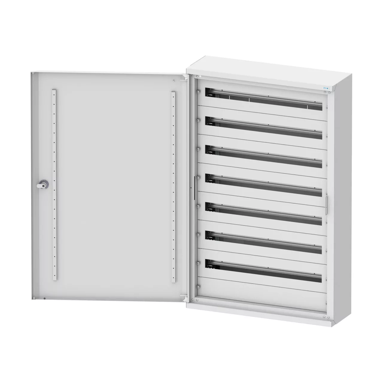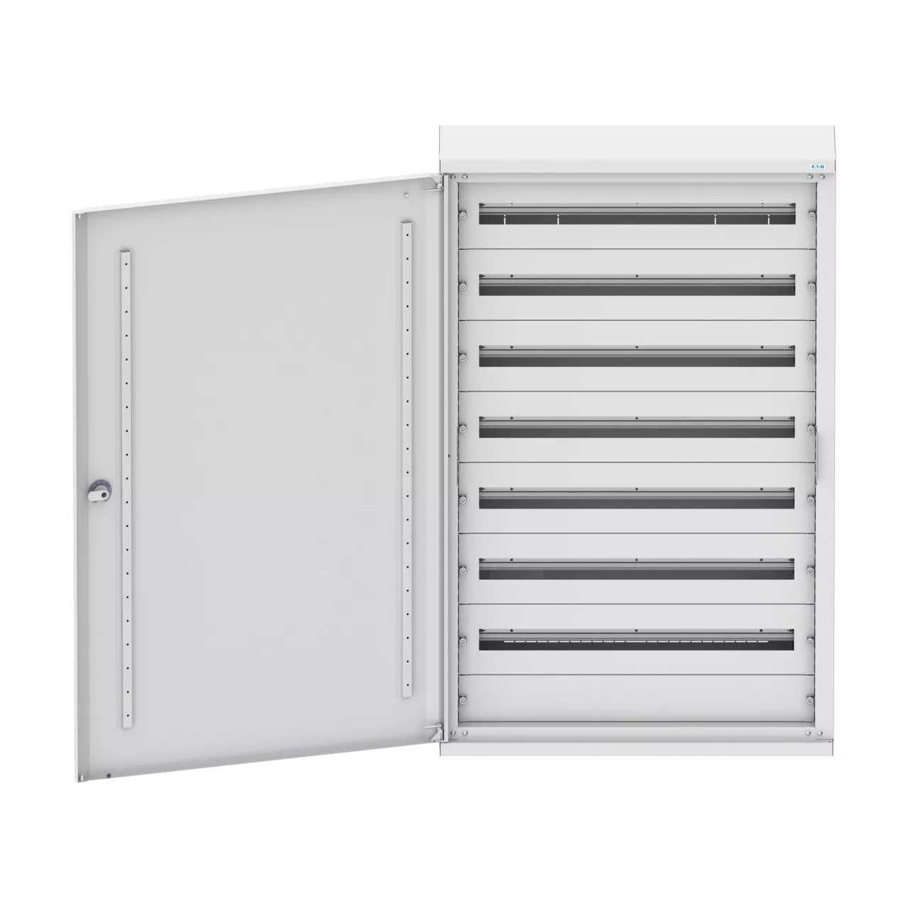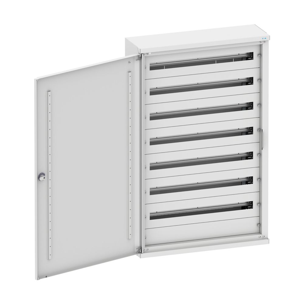 Aufputz-Installationsverteiler mit Drehriegel – vollständig montiert, IP30, grau, RAL 7035, Breite 800 mm, Außenhöhe = 1260 mm, 245 HP, 7-reihig, inkl. Grundrahmen, Seitenwände, Boden/Dach-Paneele und Tür, enthält BPZ-DINR… DIN-Schienen-Sätze, enthält Frontplatten (150 mm) mit Geräteausschnitt (45 mm), einschließlich Kabelführung oben, mit Durchsteckflansch, mit Boden-Paneele blind, auf Grundrahmen befestigt – kein Montagesatz MSW, Moduldesign, geerdete Metallabdeckungen, vollständig montiert, anreihbar, großzügiger Verdrahtungsraum, variabler Innenausbau mit oder ohne herausnehmbarem Montagerahmen, gut strukturierte
