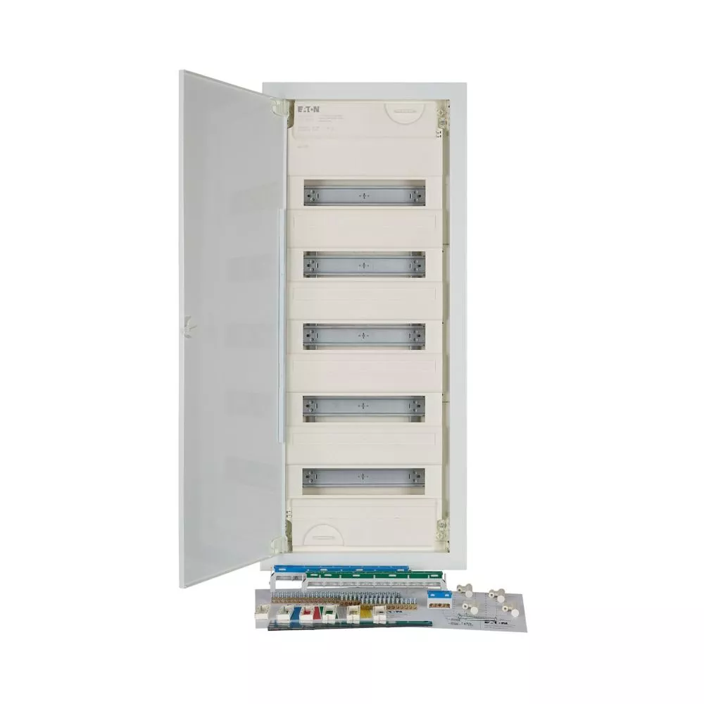 KLV Hohlwand-Kleinverteiler, Schutzklasse II, Kunststoffgehäuse mit Stahlblechtür, Frontabdeckung, plombierbar und laserbeschriftet entsprechend IEC/EN 60670-24,, plus 2 Teilungseinheiten Reserve je Reihe, Beschriftungsfeld in Wandkasten, flaches Türrahmendesign, robuster Türdrehriegel, Optional ersetzbar mit Sicherheitsverriegelung, Kabelhalter für saubere Verkabelung, umfangreiches Zubehör, im Lieferumfang enthalten: Gehäuse, Geräteträger, Null- und Schutzleiterklemmen mit SK Schraubtechnik, Libelle, 3D-Putzausgleich mit bis zu 18mm Tiefenausgleich