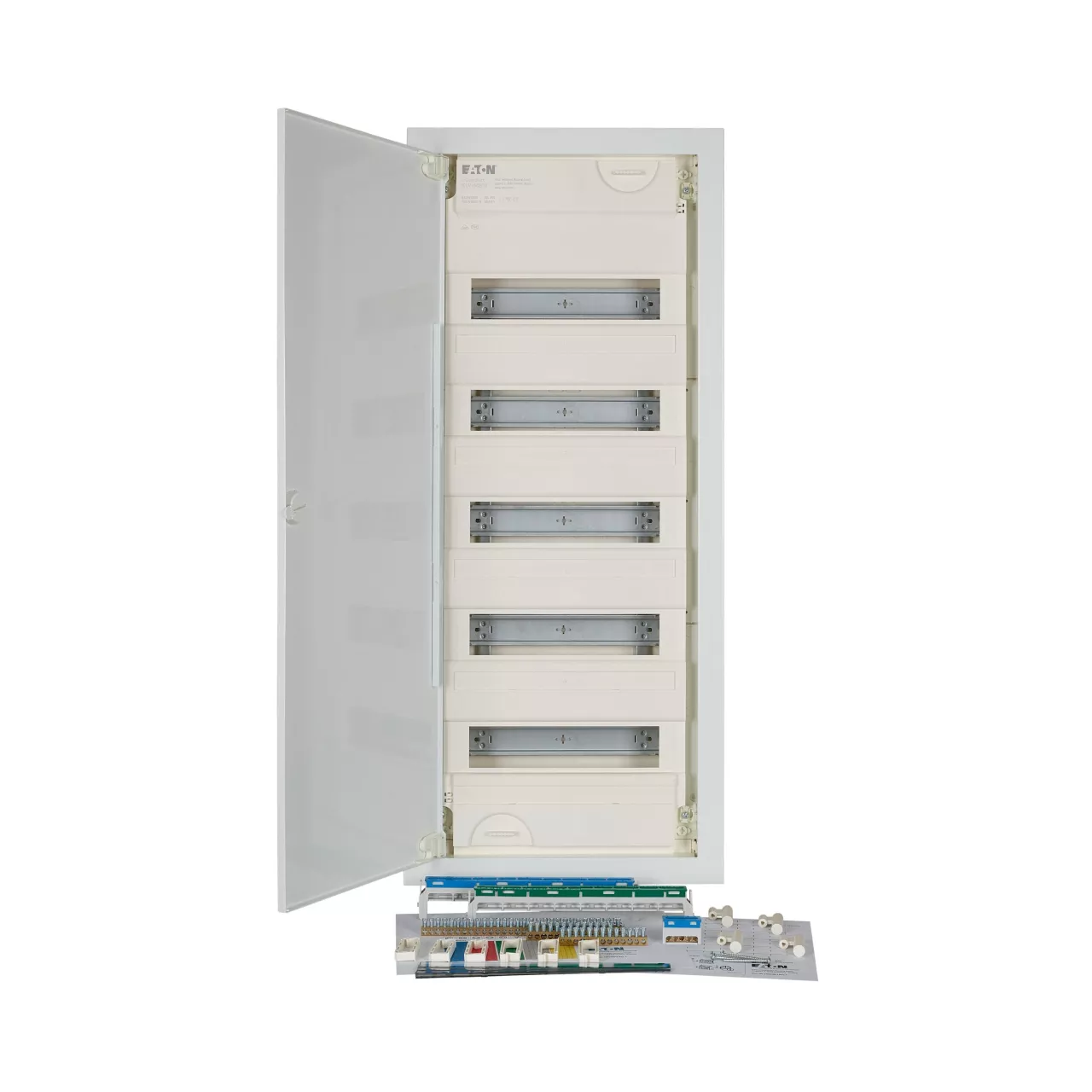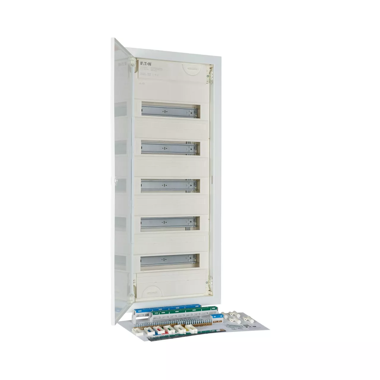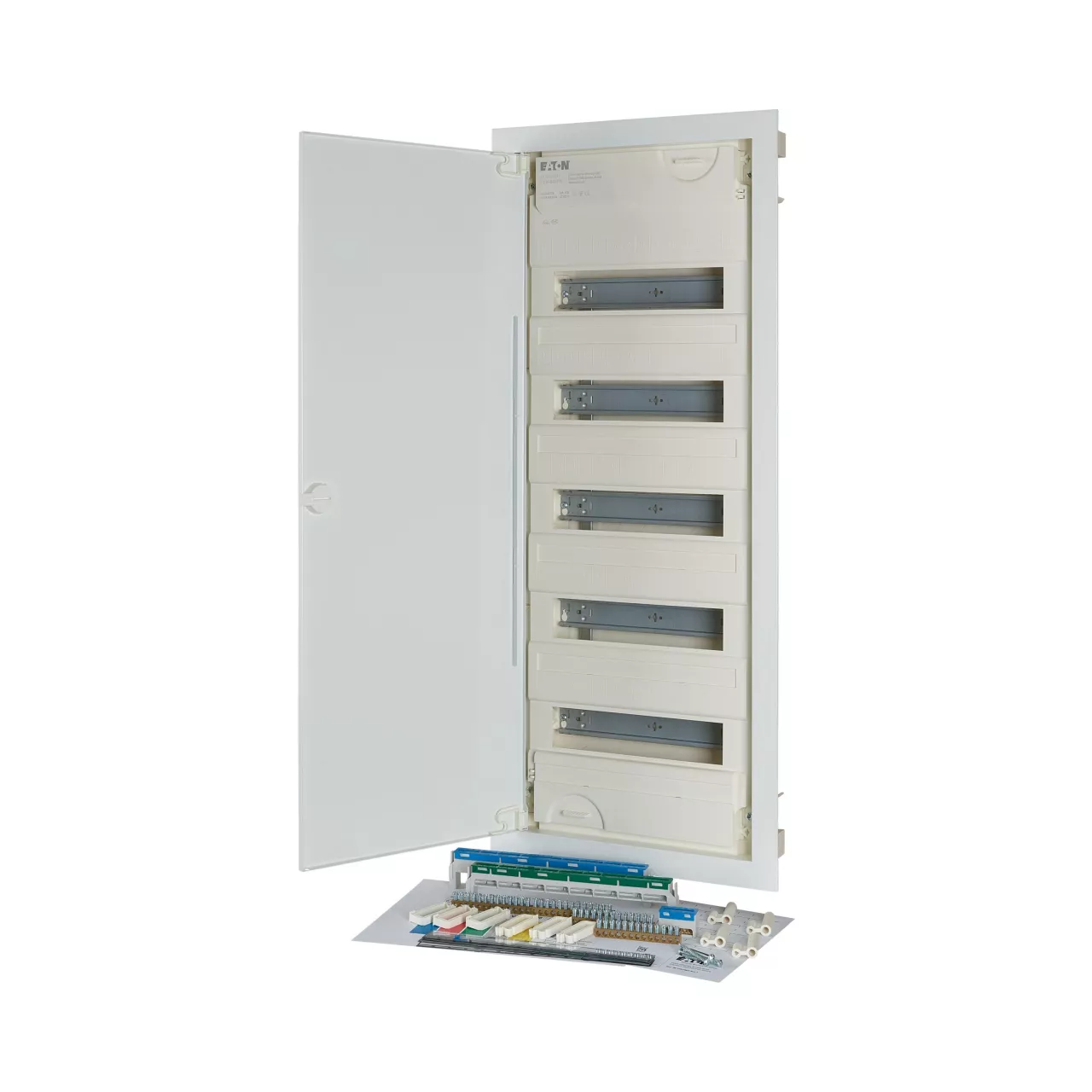 KLV Hohlwand-Kleinverteiler, Schutzklasse II, Kunststoffgehäuse mit Stahlblechtür, Frontabdeckung, plombierbar und laserbeschriftet entsprechend IEC/EN 60670-24,, plus 2 Teilungseinheiten Reserve je Reihe, Beschriftungsfeld in Wandkasten, einzigartiges, superflaches Türrahmen-Design, robuster Türdrehriegel, Optional ersetzbar mit Sicherheitsverriegelung, Kabelhalter für saubere Verkabelung, umfangreiches Zubehör, im Lieferumfang enthalten: Gehäuse, Geräteträger, Null- und Schutzleiterklemmen mit SK Schraubtechnik, Libelle