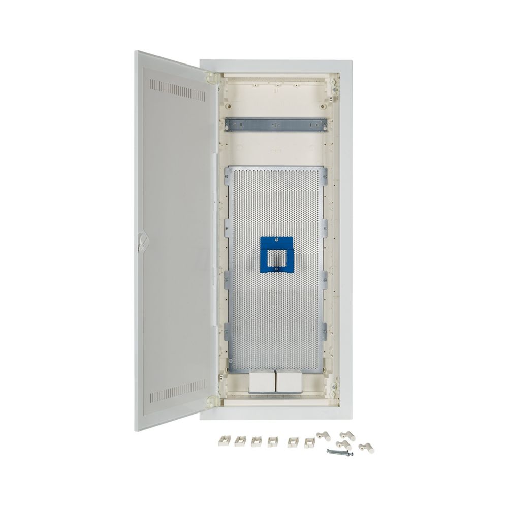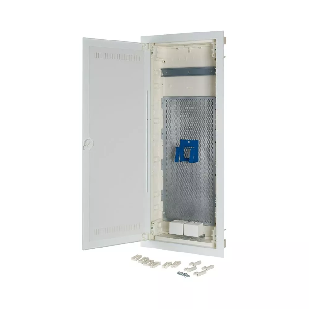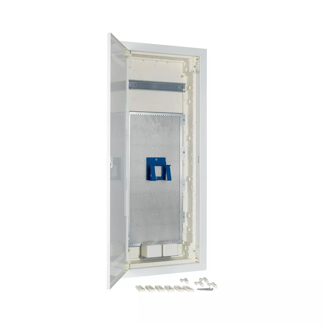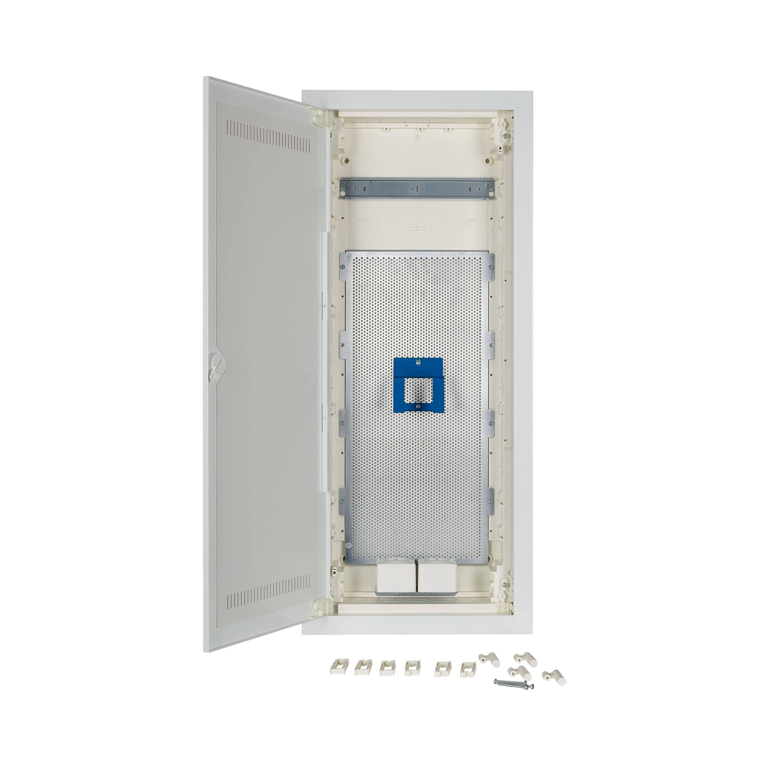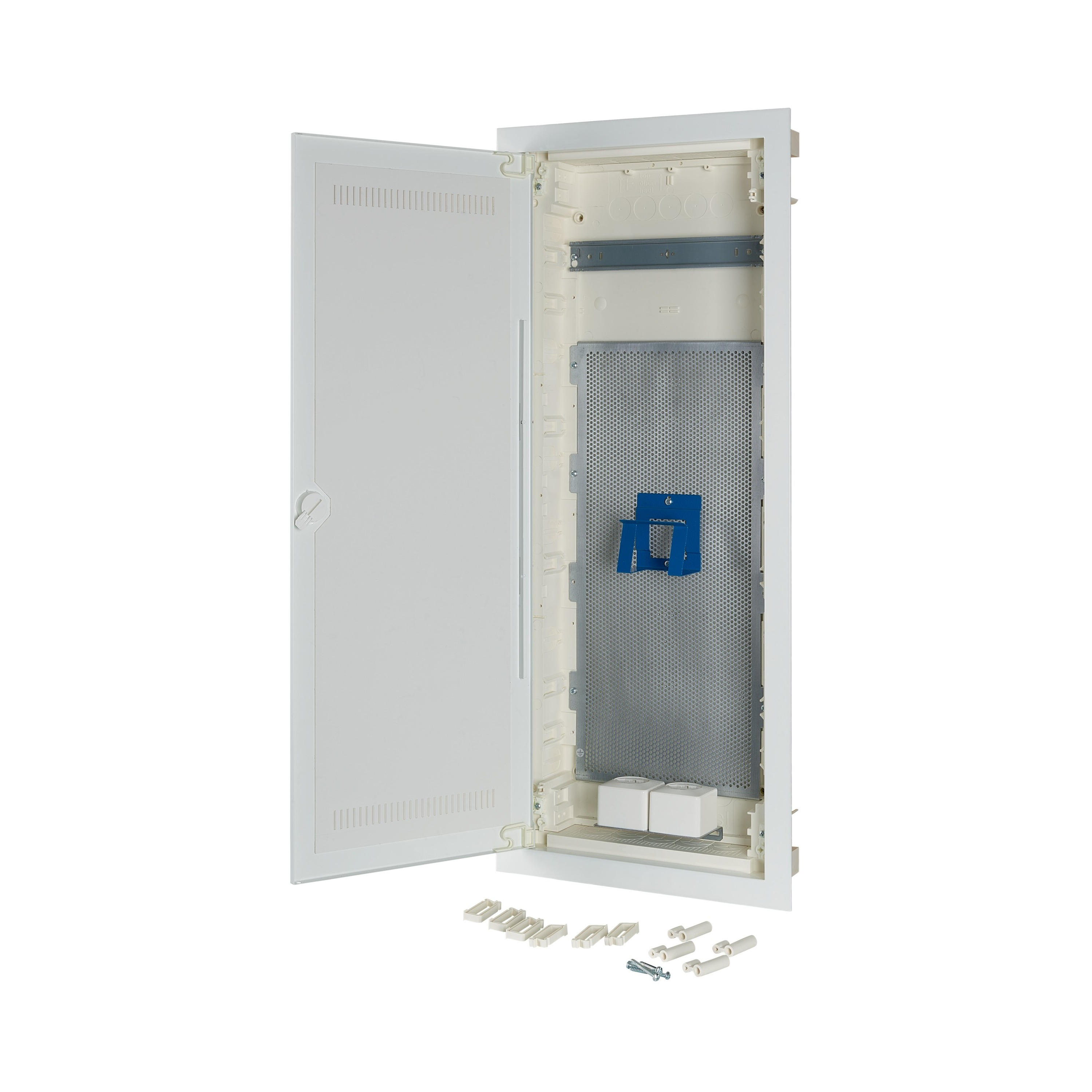 KLV Hohlwand-Multimediaverteiler, Kunststoff-Verteiler mit Stahlblechtür und Belüftungsöffnungen, Beschriftungsfeld in Wandkasten, einzigartiges, superflaches Türrahmen-Design, robuster Türdrehriegel, Optional ersetzbar mit Sicherheitsverriegelung, Kabelhalter für saubere Kabelführung, umfangreiches Zubehör, im Lieferumfang enthalten: Gehäuse, 1x Tragschiene, Mikroperforierte Montageplatte, 1x Geräteträger, 2x einfache Steckdose und Euro2-Adapter, Libelle, 3D-Putzausgleich mit bis zu 18mm Tiefenausgleich, Kabelbinder, Hohlwandanker, Montageanleitung