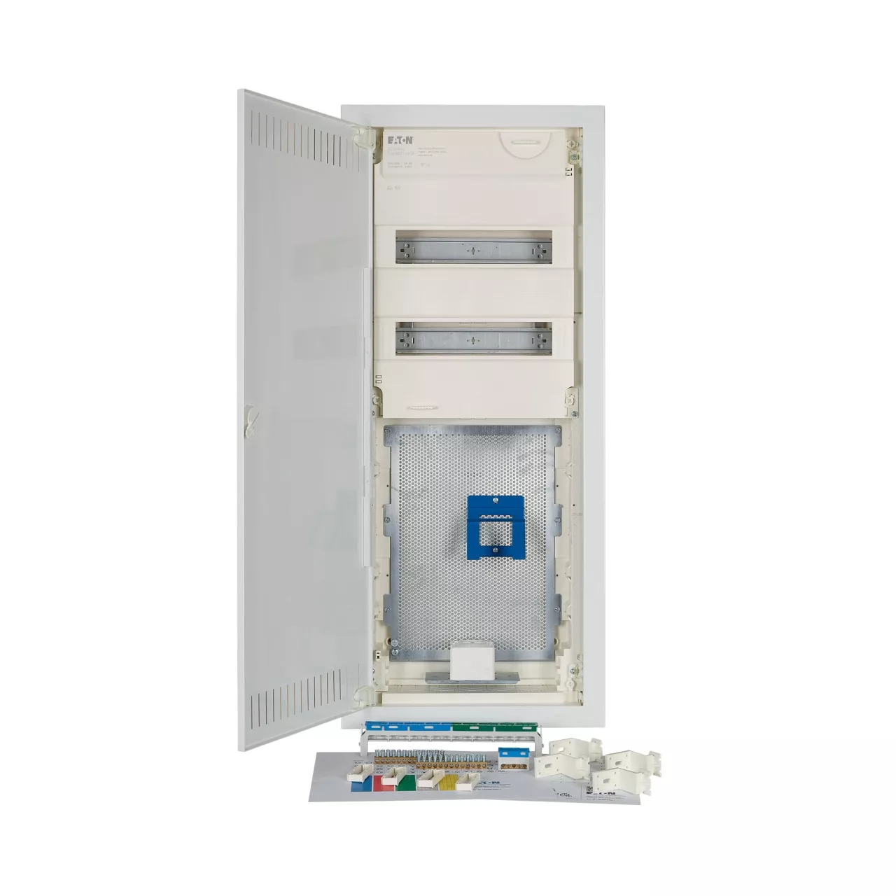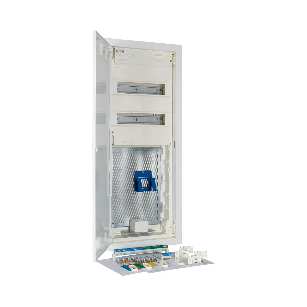 Hybrid KLV Unterputz-Kleinverteiler, Schutzklasse II, Kunststoffgehäuse mit Stahlblechtür, Frontabdeckung, plombierbar und laserbeschriftet entsprechend IEC/EN 60670-24,, plus 2 Teilungseinheiten Reserve je Reihe, Beschriftungsfeld in Wandkasten, einzigartiges, superflaches Türrahmen-Design, robuster Türdrehriegel, Optional ersetzbar mit Sicherheitsverriegelung, Kabelhalter für saubere Verkabelung, umfangreiches Zubehör, im Lieferumfang enthalten: Gehäuse, Geräteträger, Null- und Schutzleiterklemmen mit SK Schraubtechnik, Libelle zum Ausrichten
