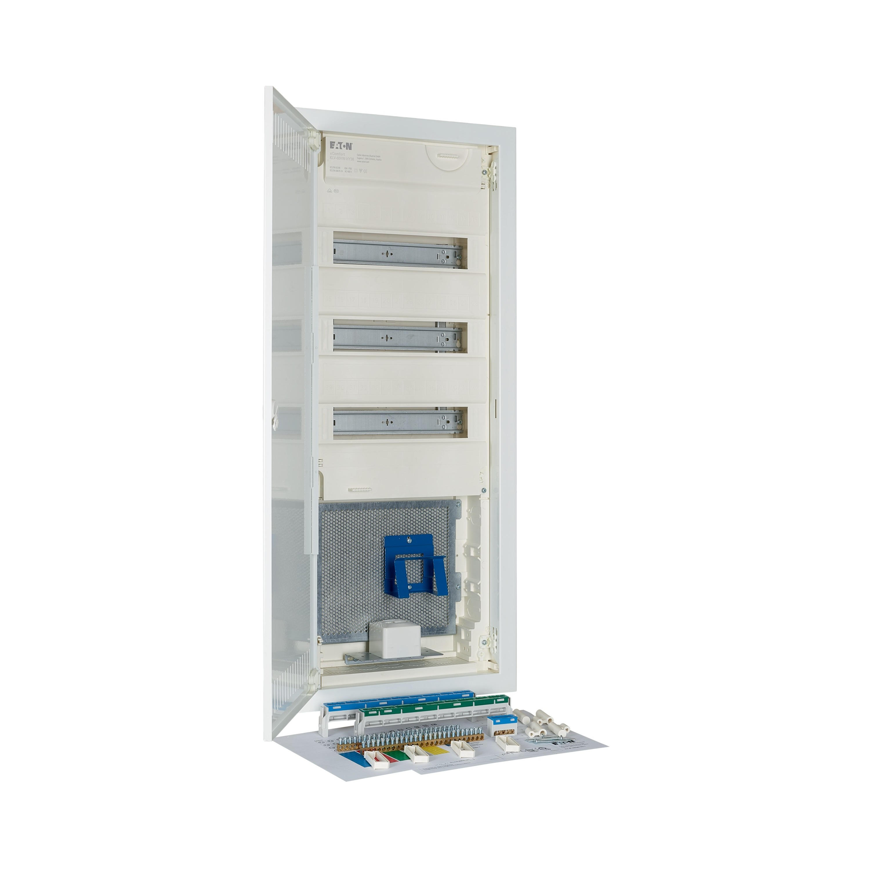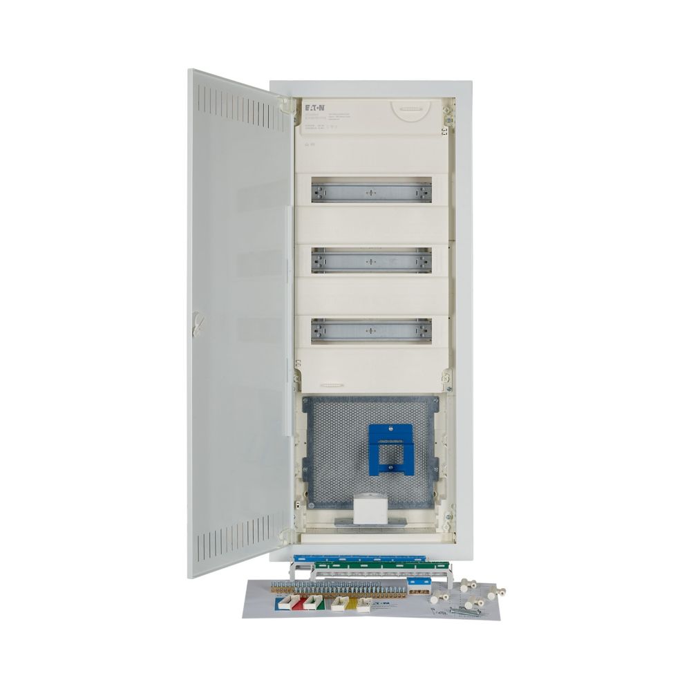 Hybrid KLV Hohlwand-Kleinverteiler, Schutzklasse II, Kunststoffgehäuse mit Stahlblechtür, Frontabdeckung, plombierbar und laserbeschriftet entsprechend IEC/EN 60670-24,, plus 2 Teilungseinheiten Reserve je Reihe, Beschriftungsfeld in Wandkasten, einzigartiges, superflaches Türrahmen-Design, robuster Türdrehriegel, Optional ersetzbar mit Sicherheitsverriegelung, Kabelhalter für saubere Verkabelung, umfangreiches Zubehör, im Lieferumfang enthalten: Gehäuse, Geräteträger, Null- und Schutzleiterklemmen mit SK Schraubtechnik, Libelle