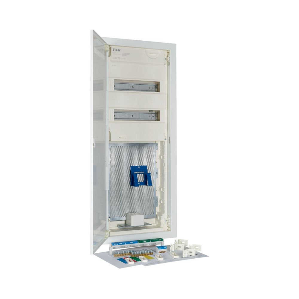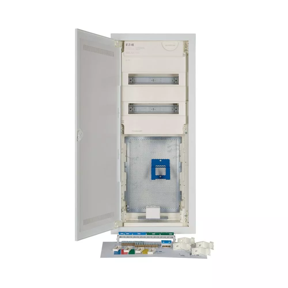 Hybrid KLV Unterputz-Kleinverteiler, Schutzklasse II, Kunststoffgehäuse mit Stahlblechtür, Frontabdeckung, plombierbar und laserbeschriftet entsprechend IEC/EN 60670-24,, plus 2 Teilungseinheiten Reserve je Reihe, Beschriftungsfeld in Wandkasten, einzigartiges, superflaches Türrahmen-Design, robuster Türdrehriegel, Optional ersetzbar mit Sicherheitsverriegelung, Kabelhalter für saubere Verkabelung, umfangreiches Zubehör, im Lieferumfang enthalten: Gehäuse, Geräteträger, Null- und Schutzleiterklemmen mit SK Schraubtechnik, Libelle zum Ausrichten