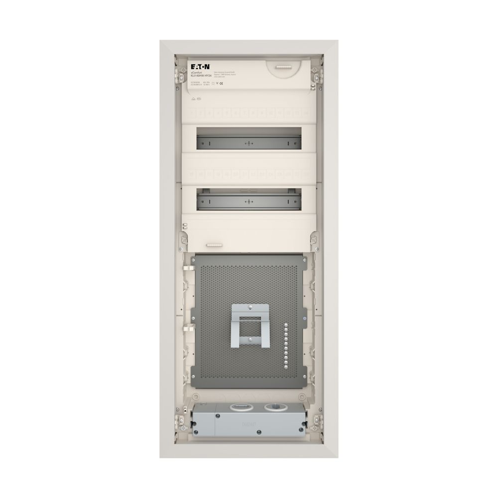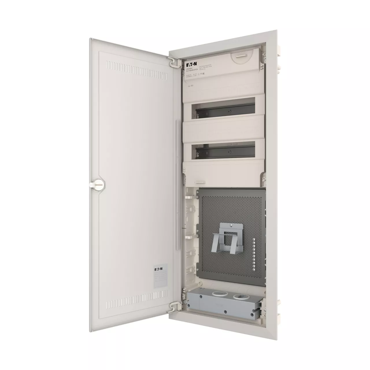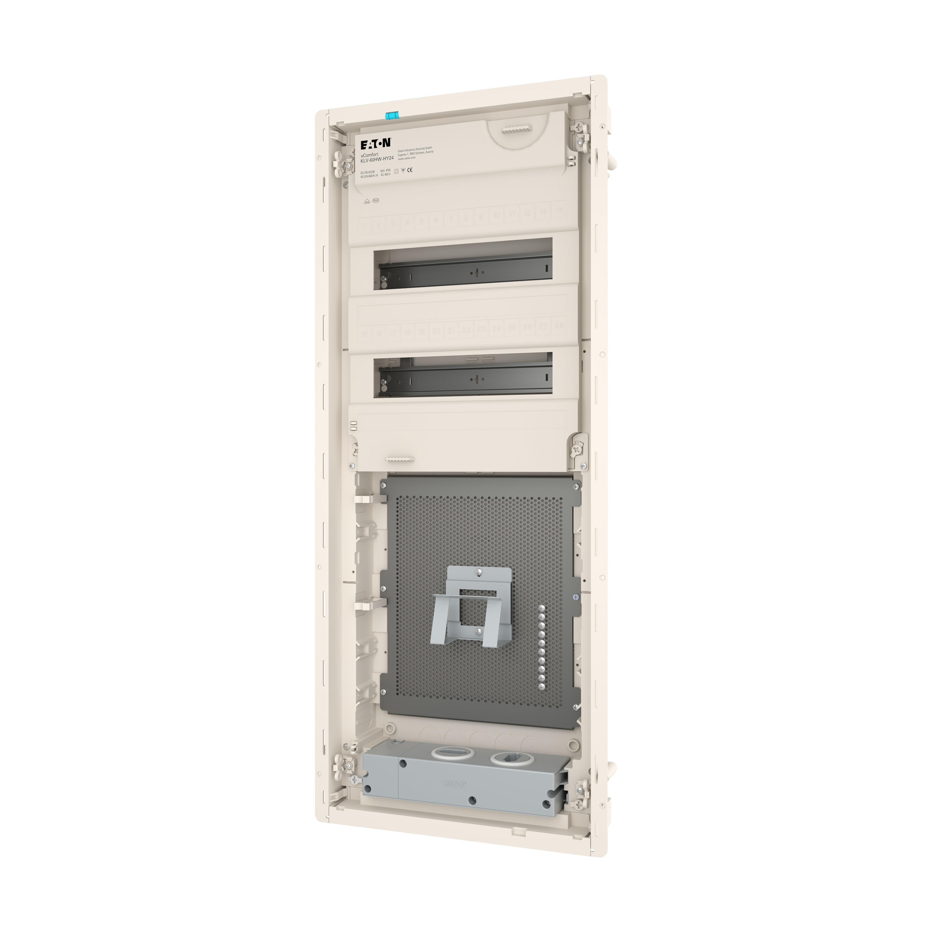 Hybrid KLV Hohlwand-Kleinverteiler, Schutzklasse II, Kunststoffgehäuse mit Stahlblechtür, Frontabdeckung, plombierbar und laserbeschriftet entsprechend IEC/EN 60670-24,, plus 2 Teilungseinheiten Reserve je Reihe, Beschriftungsfeld in Wandkasten, flaches Türrahmendesign, robuster Türdrehriegel, Optional ersetzbar mit Sicherheitsverriegelung, Kabelhalter für saubere Verkabelung, umfangreiches Zubehör, im Lieferumfang enthalten: Gehäuse, Geräteträger, Null- und Schutzleiterklemmen mit SK Schraubtechnik, Libelle