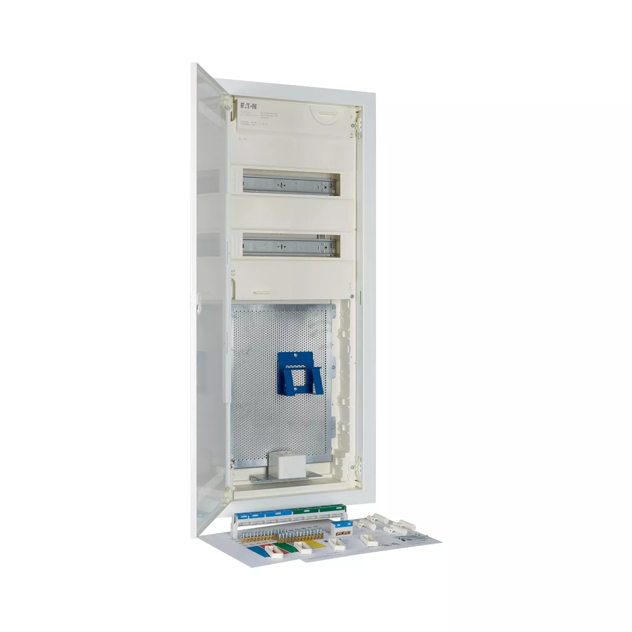 Hybrid KLV Hohlwand-Kleinverteiler, Schutzklasse II, Kunststoffgehäuse mit Stahlblechtür, Frontabdeckung, plombierbar und laserbeschriftet entsprechend IEC/EN 60670-24,, plus 2 Teilungseinheiten Reserve je Reihe, Beschriftungsfeld in Wandkasten, einzigartiges, superflaches Türrahmen-Design, robuster Türdrehriegel, Optional ersetzbar mit Sicherheitsverriegelung, Kabelhalter für saubere Verkabelung, umfangreiches Zubehör, im Lieferumfang enthalten: Gehäuse, Geräteträger, Null- und Schutzleiterklemmen mit SK Schraubtechnik, Libelle