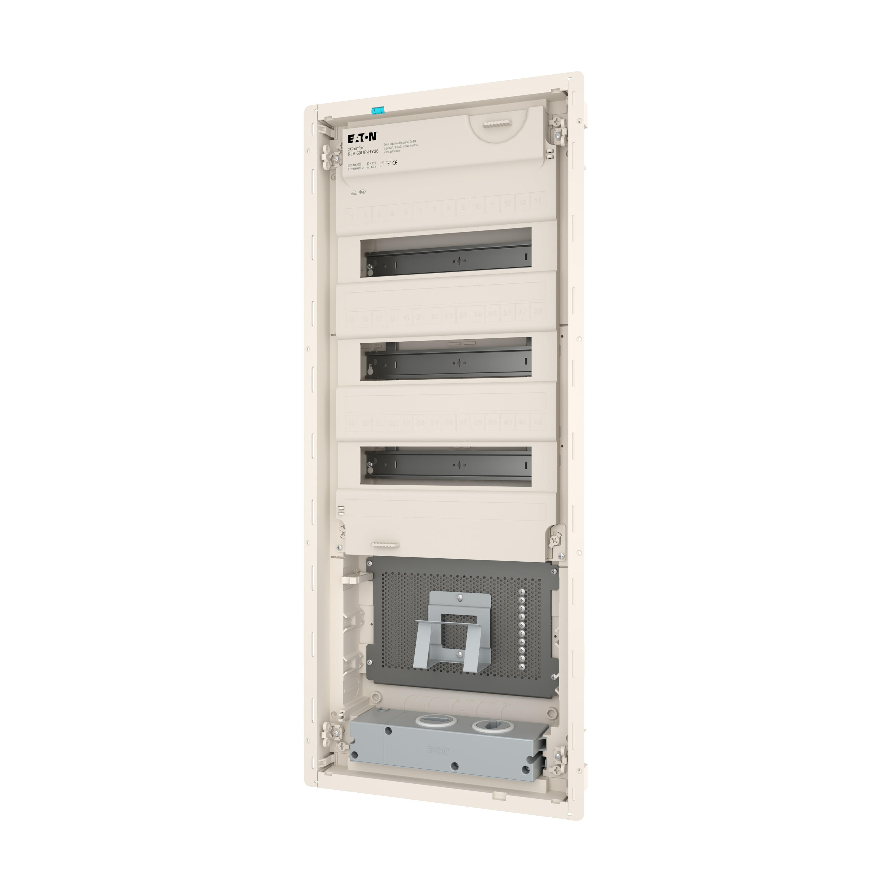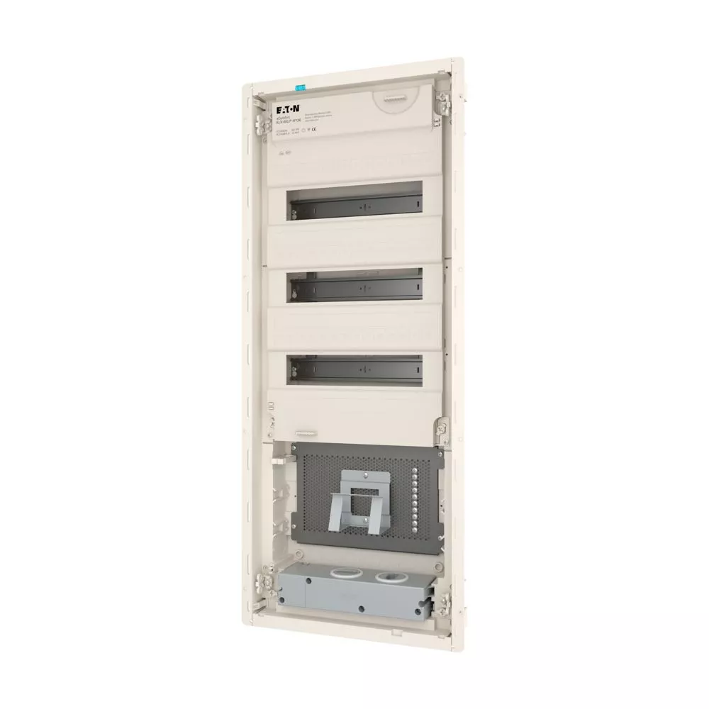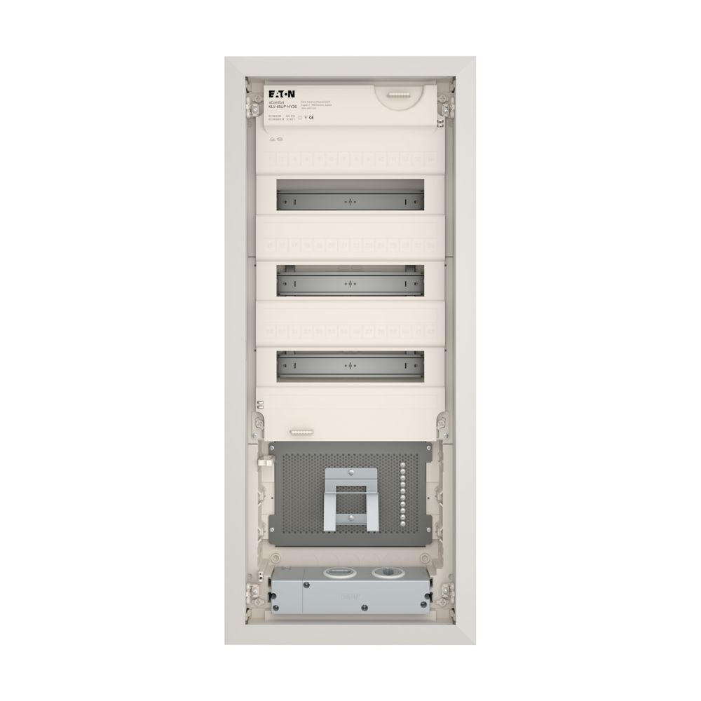 Hybrid KLV Unterputz-Kleinverteiler, Schutzklasse II, Kunststoffgehäuse mit Stahlblechtür, Frontabdeckung, plombierbar und laserbeschriftet entsprechend IEC/EN 60670-24,, plus 2 Teilungseinheiten Reserve je Reihe, Beschriftungsfeld in Wandkasten, flaches Türrahmendesign, robuster Türdrehriegel, Optional ersetzbar mit Sicherheitsverriegelung, Kabelhalter für saubere Verkabelung, umfangreiches Zubehör, im Lieferumfang enthalten: Gehäuse, Geräteträger, Null- und Schutzleiterklemmen mit SK Schraubtechnik, Libelle zum Ausrichten