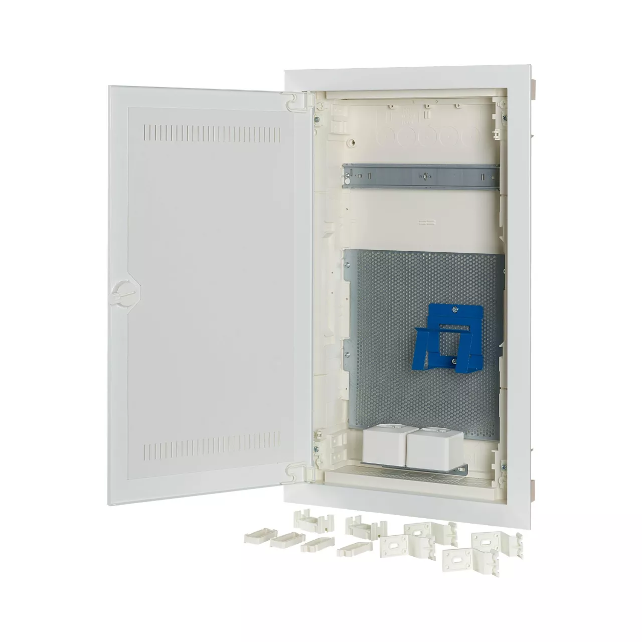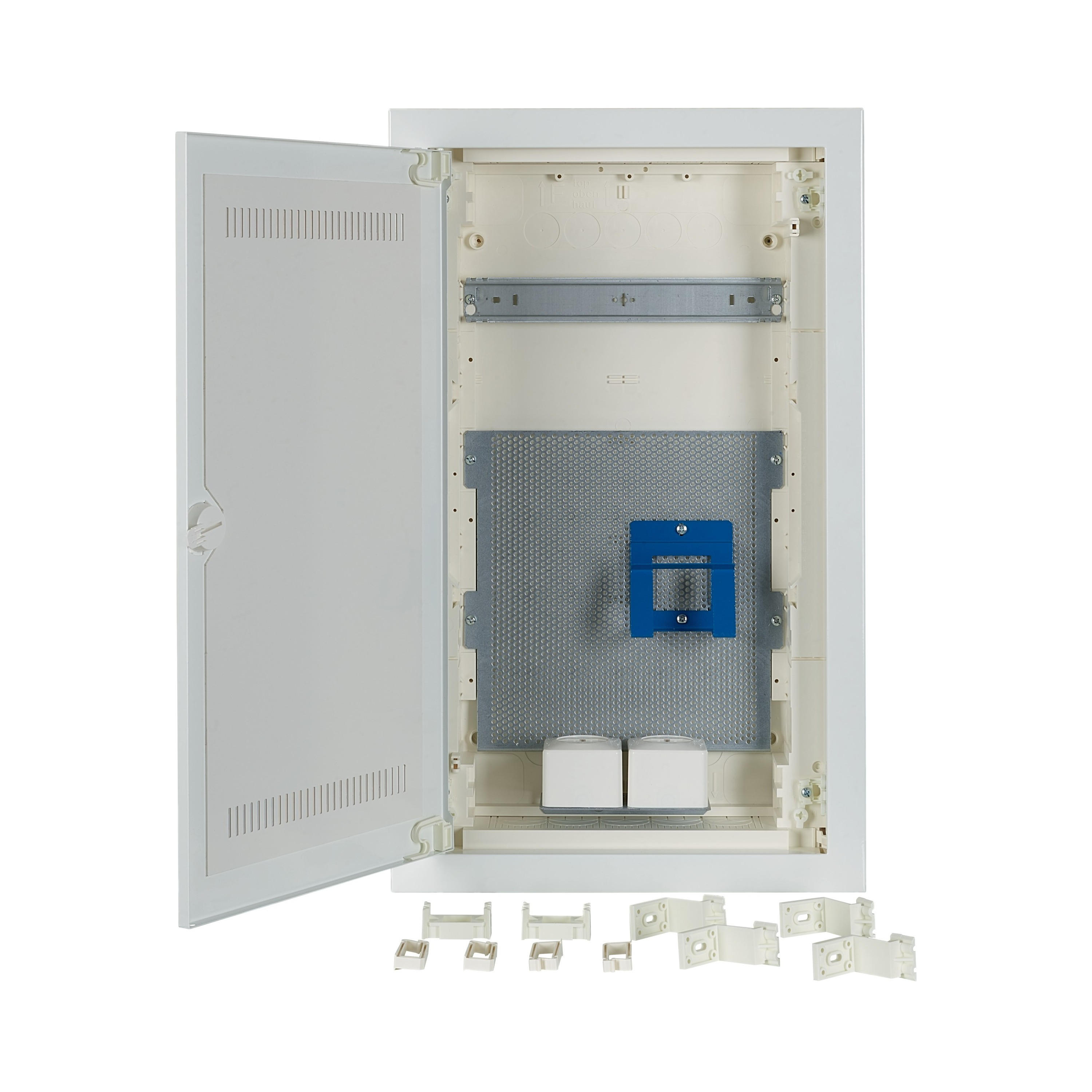 Unterputz-Multimediaverteiler KLV, Kunststoff-Verteiler mit Stahlblechtür und Belüftungsöffnungen, Beschriftungsfeld in Wandkasten, einzigartiges, superflaches Türrahmen-Design, robuster Türdrehriegel, Optional ersetzbar mit Sicherheitsverriegelung, Kabelhalter für saubere Kabelführung, umfangreiches Zubehör, im Lieferumfang enthalten: Gehäuse, 1x Tragschiene, Mikroperforierte Montageplatte, 1x Geräteträger, 2x einfache Steckdose und Euro2-Adapter, Libelle zum Ausrichten, 3D-Putzausgleich mit bis zu 18mm Tiefenausgleich, Kabelbinder, Nagellaschen, Montageanleitung