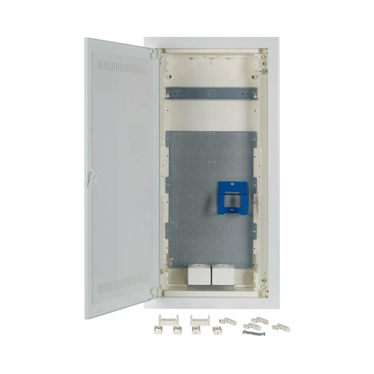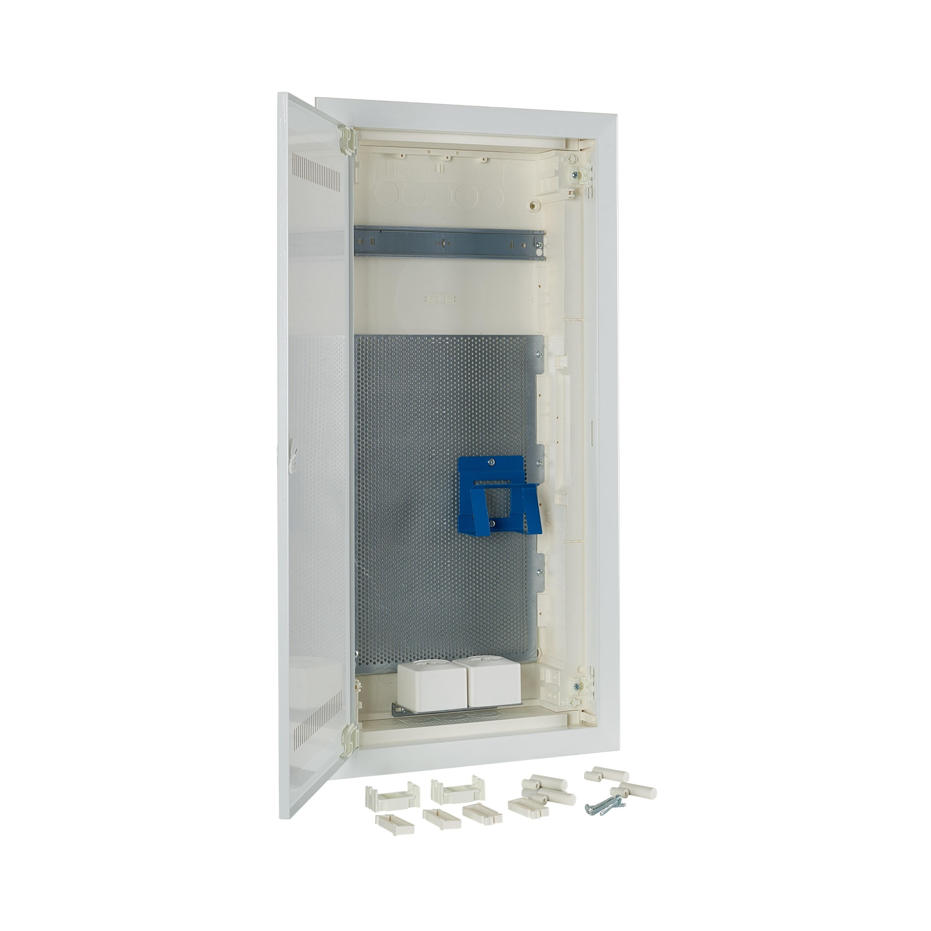 KLV Hohlwand-Multimediaverteiler, Kunststoff-Verteiler mit Stahlblechtür und Belüftungsöffnungen, Beschriftungsfeld in Wandkasten, einzigartiges, superflaches Türrahmen-Design, robuster Türdrehriegel, Optional ersetzbar mit Sicherheitsverriegelung, Kabelhalter für saubere Kabelführung, umfangreiches Zubehör, im Lieferumfang enthalten: Gehäuse, 1x Tragschiene, Mikroperforierte Montageplatte, 1x Geräteträger, 2x einfache Steckdose und Euro2-Adapter, Libelle, 3D-Putzausgleich mit bis zu 18mm Tiefenausgleich, Kabelbinder, Hohlwandanker, Montageanleitung