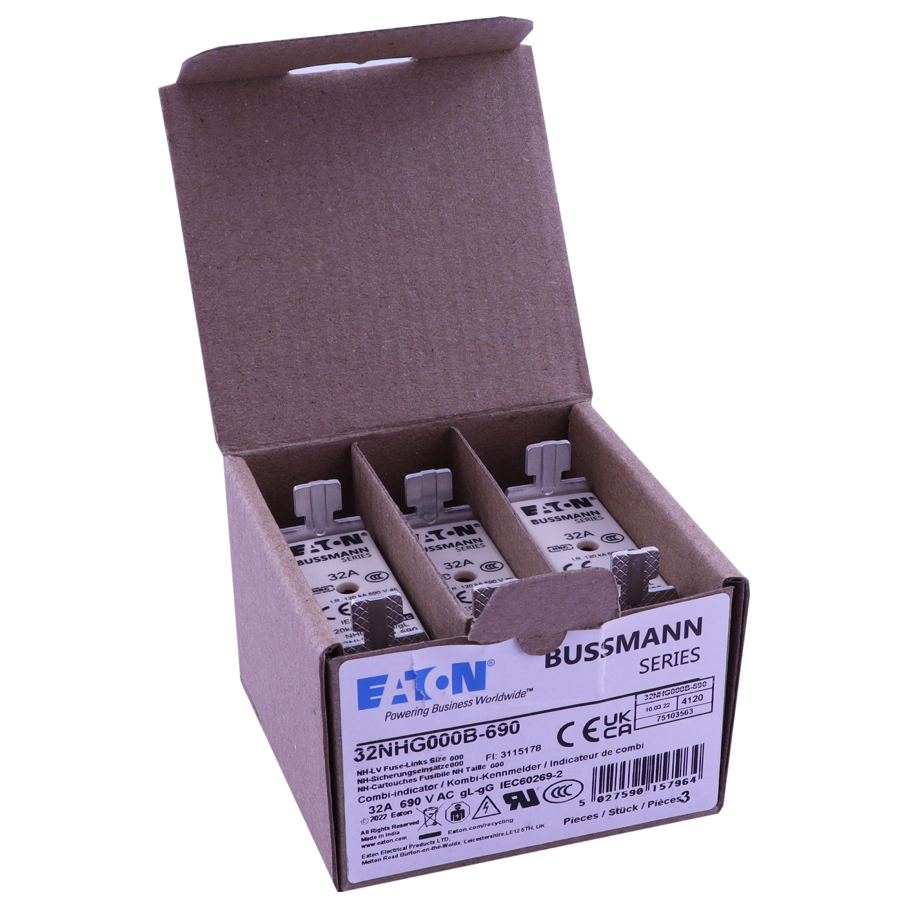 zekering, zekeringelement, Lage spanning, 32 A, AC 690 V, NH000, gL/gG, IEC, dubbel (combinatie-) meldersysteem, vierkant huis met mescontacten, onder spanning staande grepen, IEC 60269-2 zekeringsysteem A, DIN 43620, VDE 0636-2. Uitschakelvermogen 120 kA