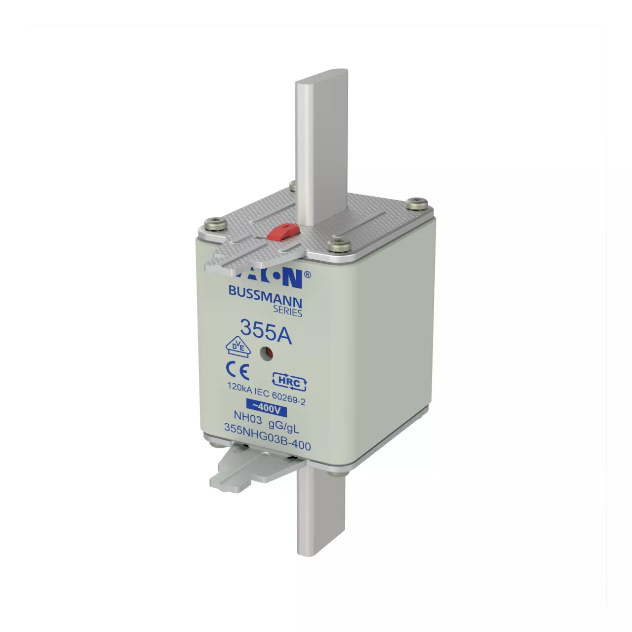 zekering, zekeringelement, Lage spanning, 355 A, AC 400 V, NH03, gL/gG, IEC, dubbel (combinatie-) meldersysteem, vierkant huis met mescontacten, onder spanning staande grepen, IEC 60269-2 zekeringsysteem A, DIN 43620, VDE 0636-2. Uitschakelvermogen 120 kA
