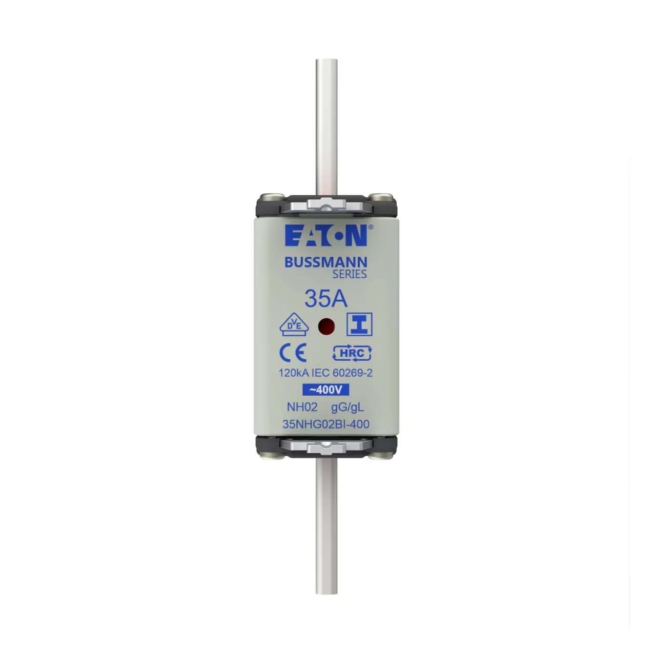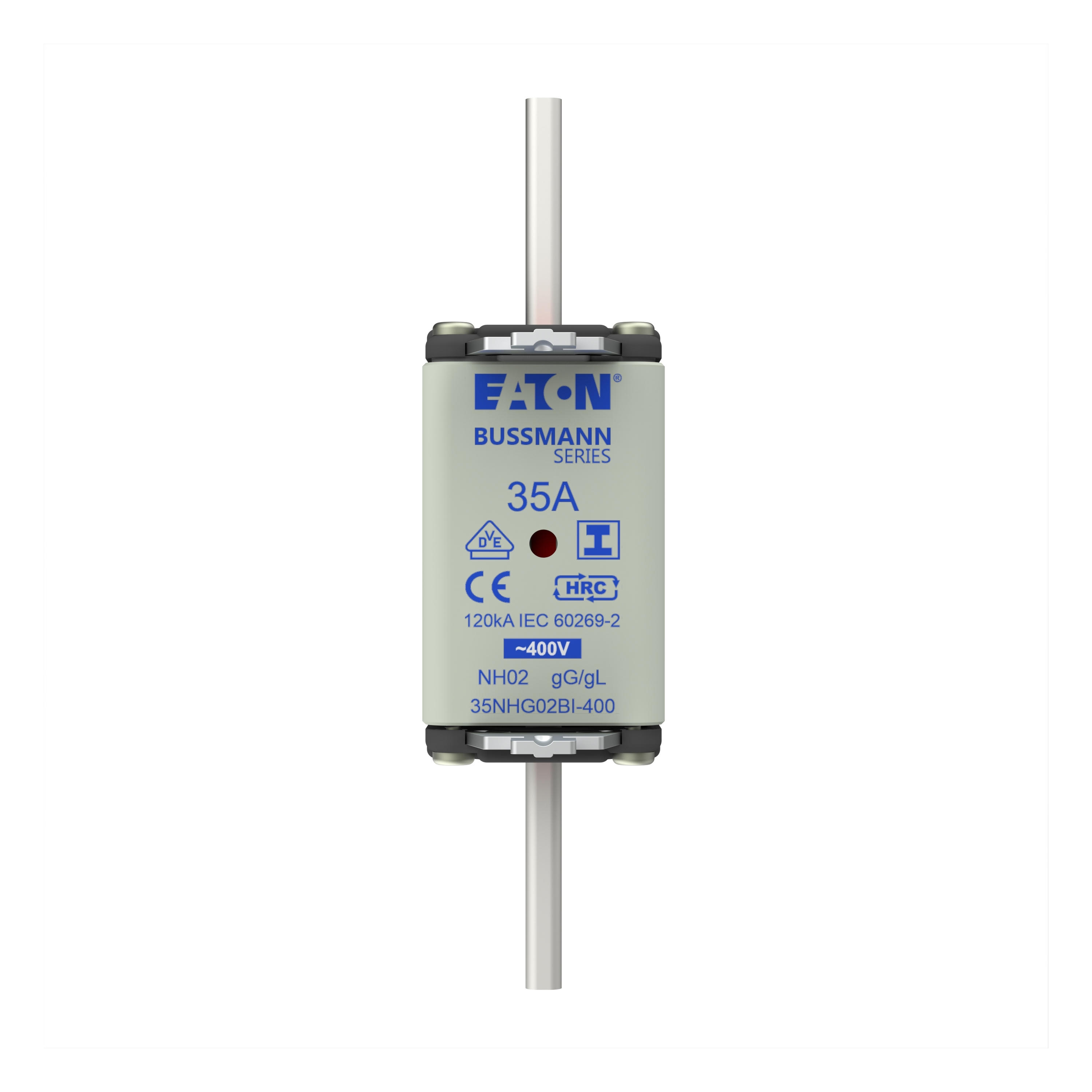 zekering, zekeringelement, Lage spanning, 35 A, AC 400 V, NH02, gL/gG, IEC, dubbel (combinatie-) meldersysteem, vierkant huis met mescontacten, geïsoleerde grepen, IEC 60269-2 zekeringsysteem A, DIN 43620, VDE 0636-2. Uitschakelvermogen 120 kA