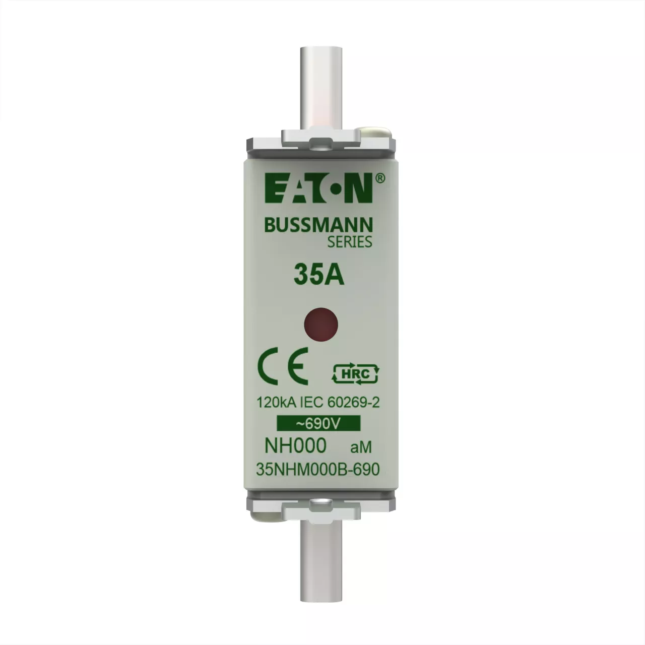 Bezpiecznik, wkładka bezpiecznikowa, niskie napięcie, 35 A, AC 690 V, NH000, aM, IEC, Układ podwójnego sygnalizatora (kombinacja), korpus kwadratowy ze stykami nożowymi, ruchome uchwyty, IEC 60269-2 układ bezpiecznikowy A, DIN 43620, VDE 0636-2. Zdolność wyłączania 120 kA