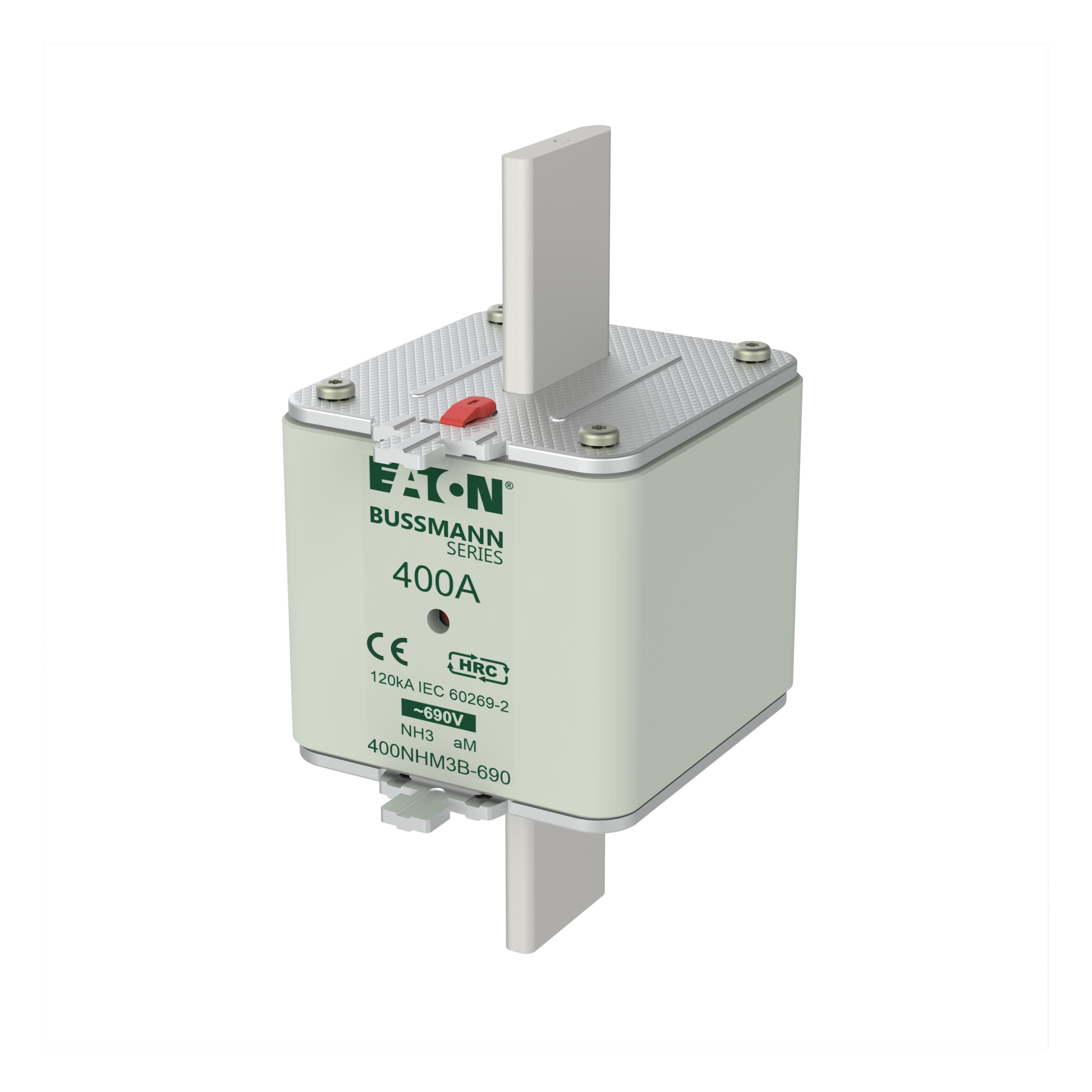 Bezpiecznik, wkładka bezpiecznikowa, niskie napięcie, 400 A, AC 690 V, NH3, aM, IEC, Układ podwójnego sygnalizatora (kombinacja), korpus kwadratowy ze stykami nożowymi, ruchome uchwyty, IEC 60269-2 układ bezpiecznikowy A, DIN 43620, VDE 0636-2. Zdolność wyłączania 120 kA
