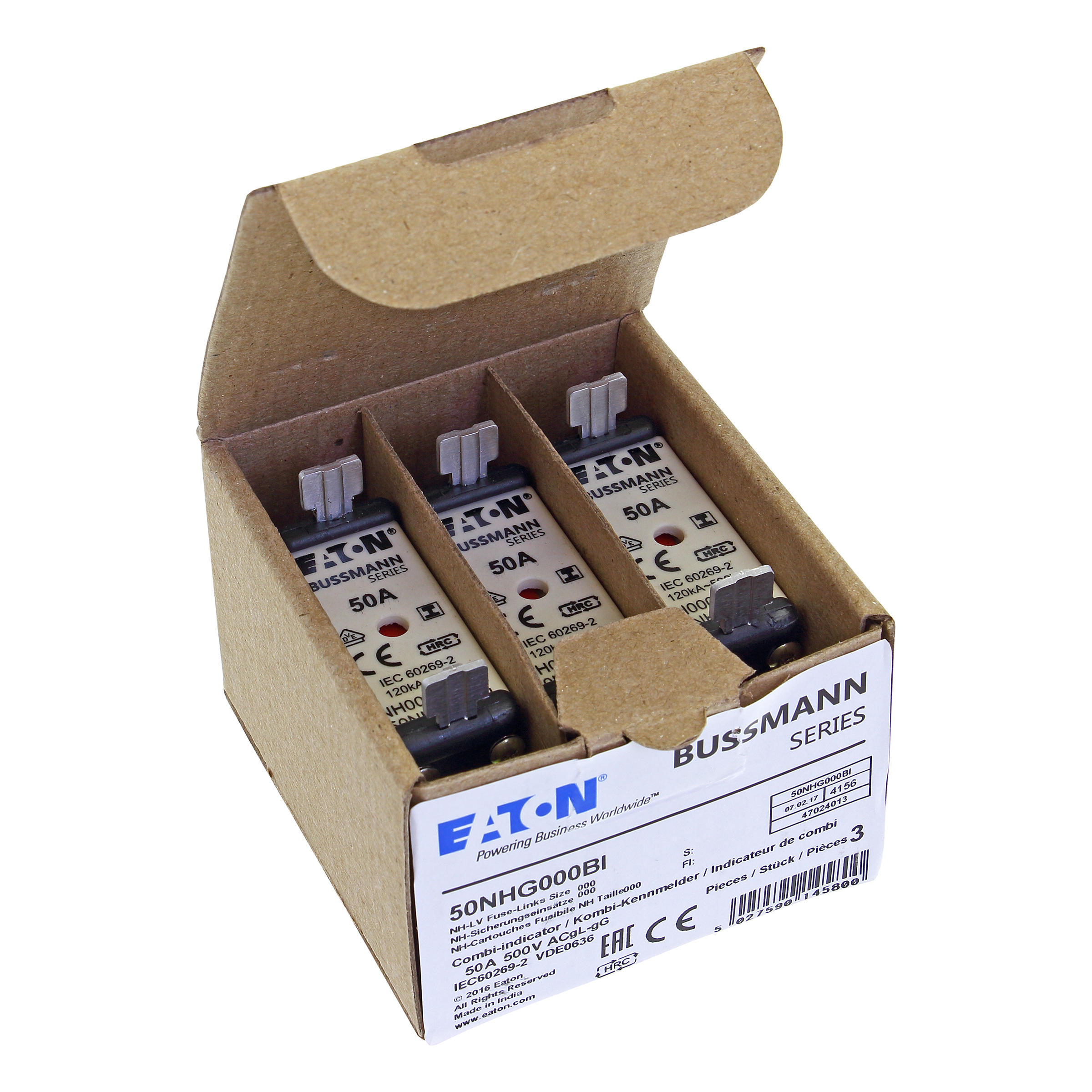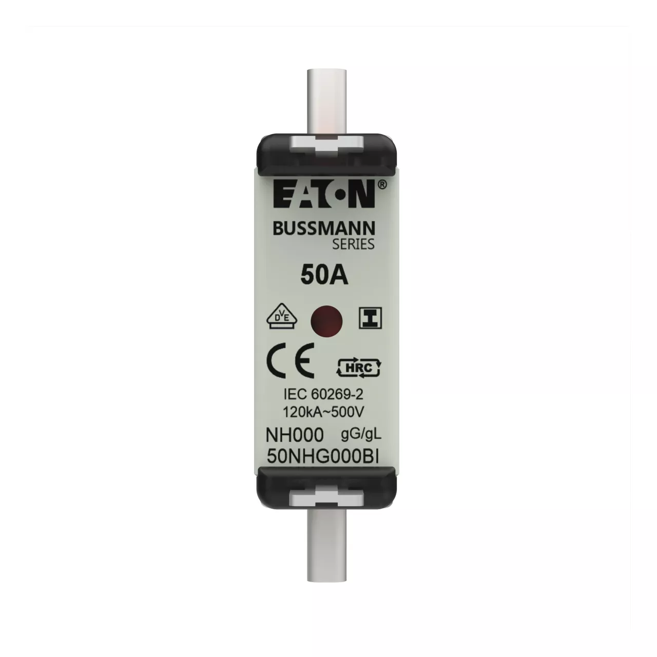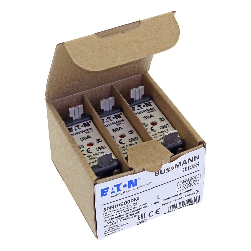 zekering, zekeringelement, Lage spanning, 50 A, AC 500 V, NH000, gL/gG, IEC, dubbel (combinatie-) meldersysteem, vierkant huis met mescontacten, geïsoleerde grepen, IEC 60269-2 zekeringsysteem A, DIN 43620, VDE 0636-2, uitschakelvermogen 120 kA